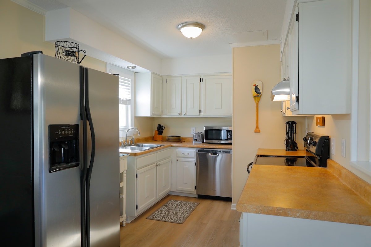 Cozy Beach Cottage | Deck, Outdoor Shower, Bike Path Large Deck with Adirondack chairs Private Outdoor Shower – rinse off after the beach Large Hammock – relax and sway in the breeze! 3 comfortable beds (1 King / 2 Queen) 3 Samsung smart TVs Remote-controlled A/C in each upstairs bedroom Bluetooth Stereo Receiver 5G WiFi Drip Coffeemaker, Keurig, Grinder Full-Size Washer/Dryer Sheets and bath/kitchen towels included – BYO beach towels! Beach Cart for your use Covered Parking for 3 cars