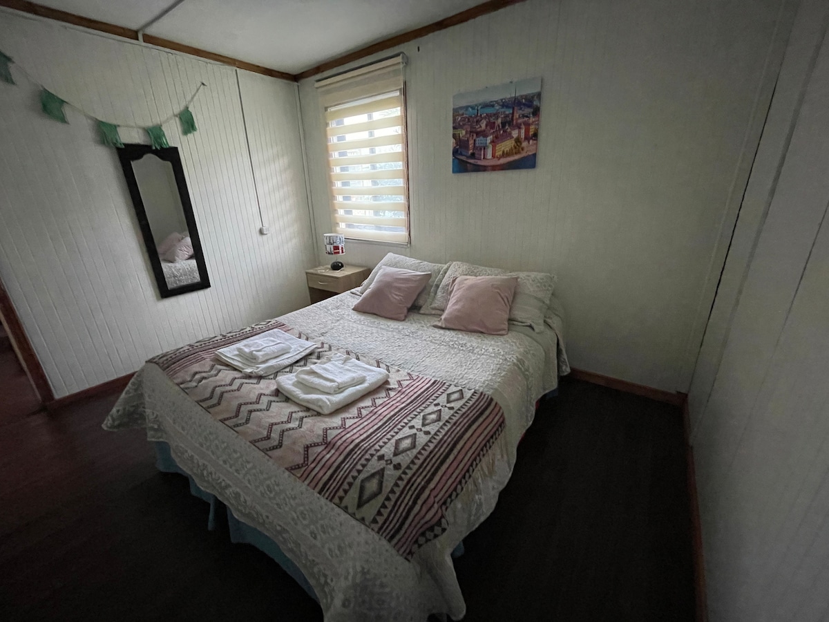 Cómoda y acogedora cabaña rodeada de naturaleza. Cuenta con Wii-fii y estacionamiento privado, capacidad para 5 personas - tres habitaciones - dos baños. - cama matrimonial - cama nido - cama individual Cocina equipada (horno, microondas, tostador, refrigerador, etc.) Ubicada a pasos del centro de la ciudad, playa y centros de abastecimiento (mini-market, botillería, carnicería, bomba de bencina, vulcanización, etc.)