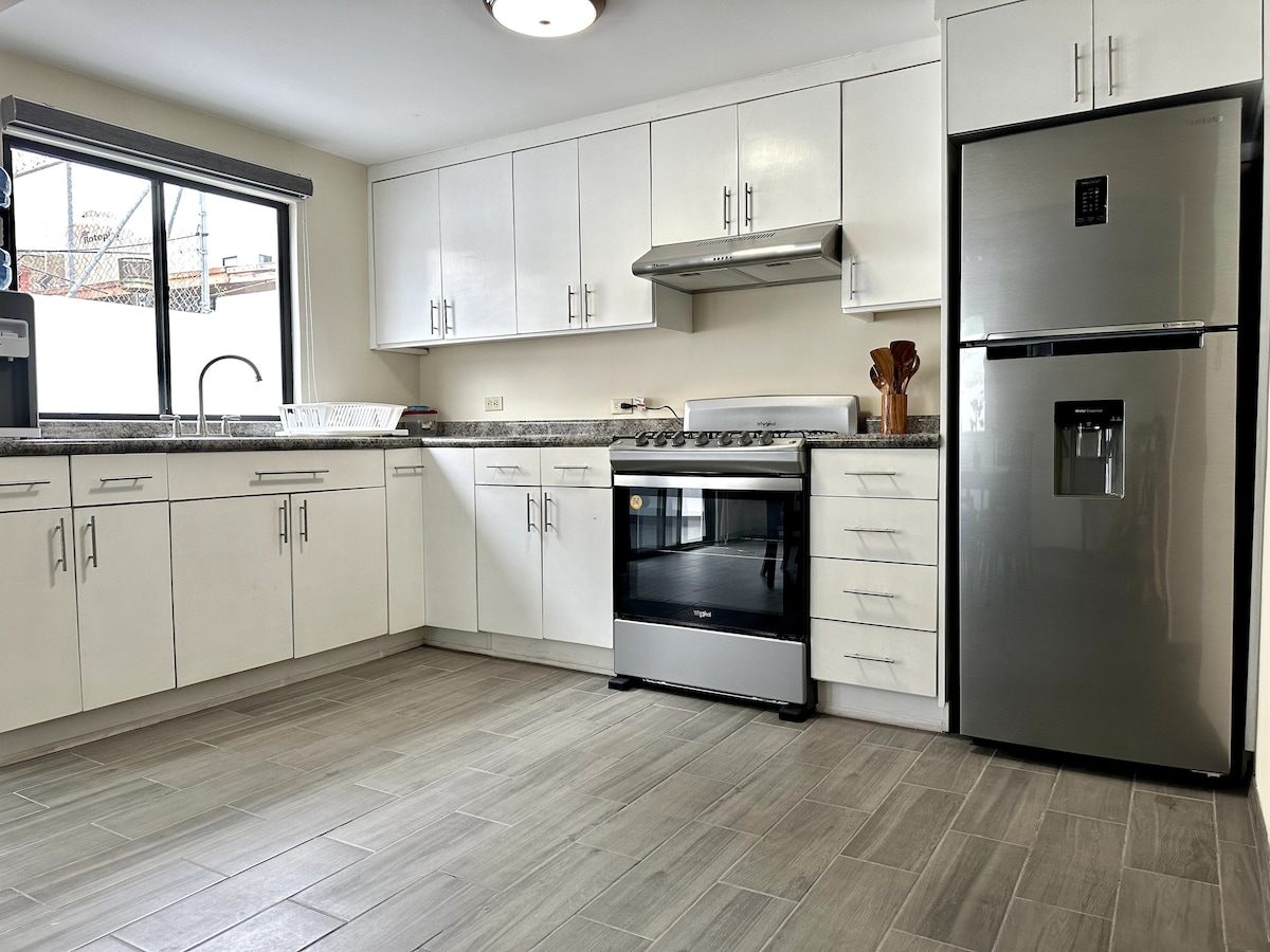 Hermosa casa amplia y acogedora, muy limpia. a solo 10 -15 minutos del centro de la ciudad y malecon de Ensenada. 2 pisos, 4 recámaras, todas son en la parte de arriba. Sala con chimenea, cocina, comedor y medio baño son en la parte de abajo. Espacio para 10 personas, Patio/jardín totalmente privado con pergola, medio baño y espacio de asador. puedes disfrutar una rica comida o cena en una hermosa cocina con todos los accesorios y utencilios necesarios para preparar los alimentos.