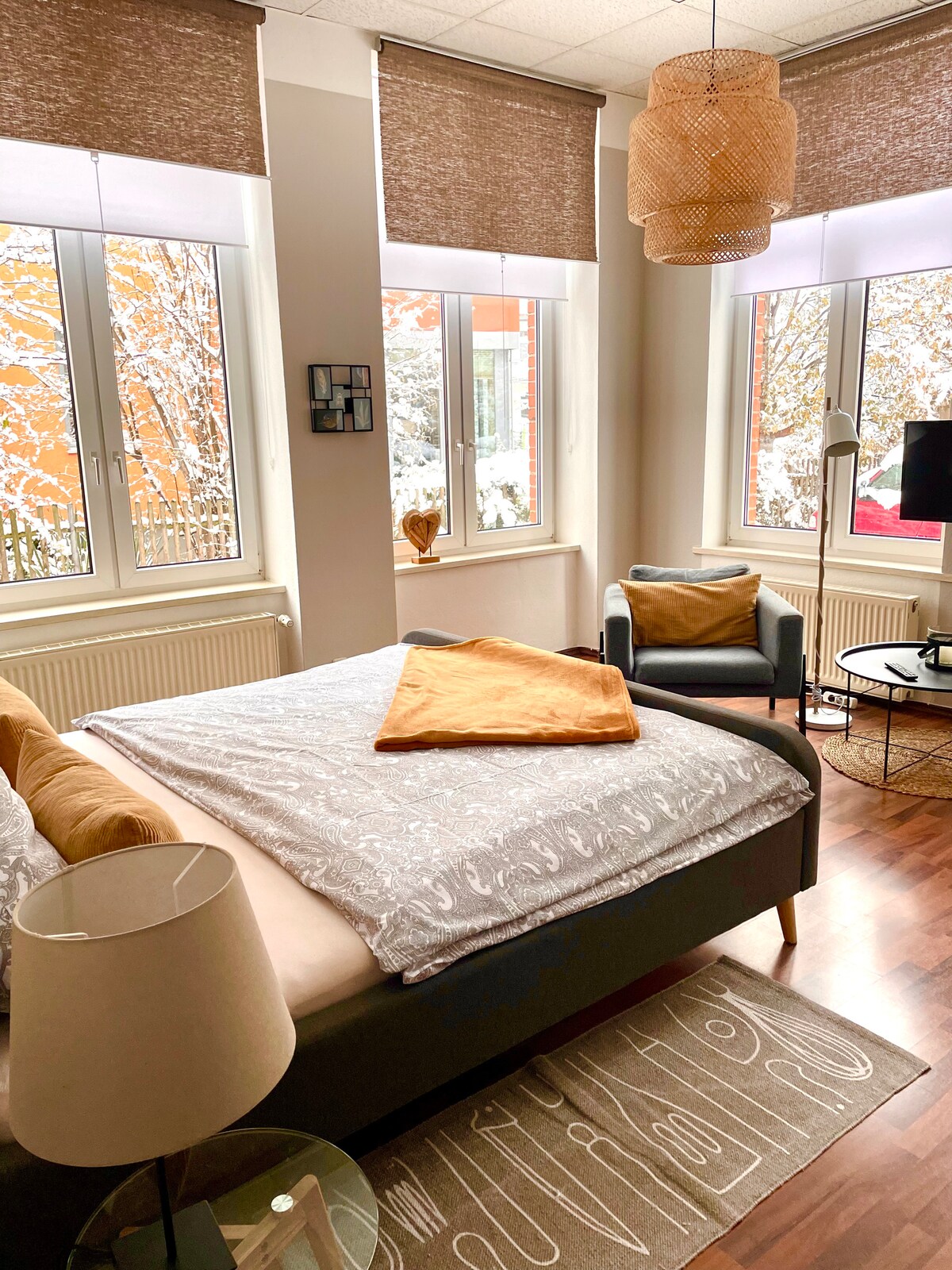 El departamento está en el segundo piso de un edificio de departamentos directamente en el casco antiguo de Erfurt, en una ubicación céntrica pero tranquila. También es de fácil acceso por el ascensor existente. Los servicios incluyen una habitación grande y luminosa con una sala de estar acogedora y una cocina con una zona para sentarse. El dormitorio es una habitación separada. Está a solo unos minutos a pie de Anger o Domplatz. Una parada de tranvía también está muy cerca.