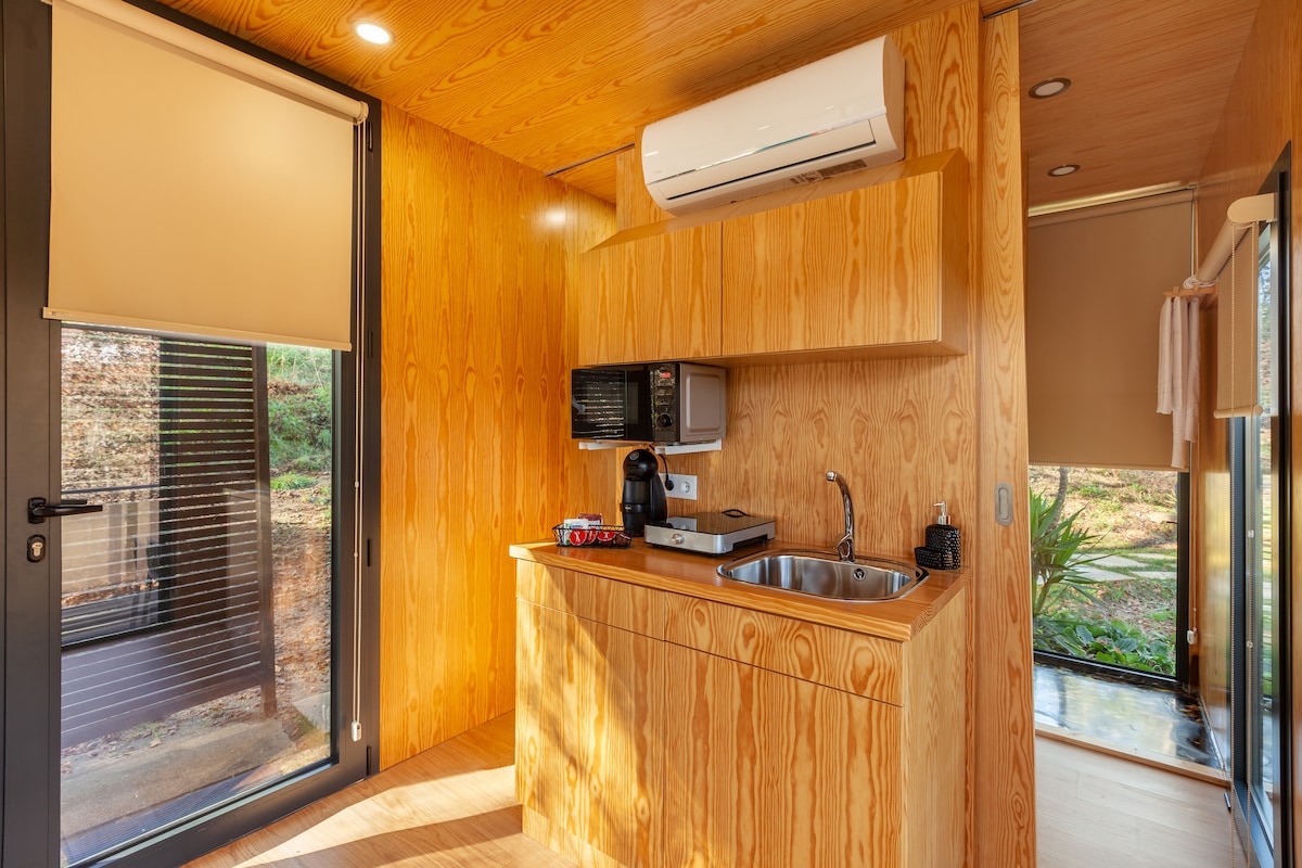Com janelas panorâmicas que conferem ao ambiente uma sensação de amplitude, permitem a entrada de luz natural e vistas deslumbrantes. Dispõe de uma sala de estar, uma área de refeições totalmente equipada, um quarto independente com casa de banho privativa e cabine de duche, uma casa de banho no quarto e um SPA Jacuzzi numa plataforma exterior. As Villas Monte dos Xistos, na montanha e rodeadas por vinhas e bosques, desfrutam de uma localização, a 10 km do centro histórico de Guimarães