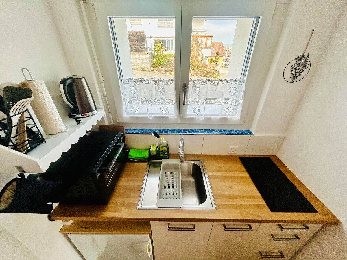 Cosy 1-room flat on the ground floor with separate entrance. Free parking. You will stay in our home in a quiet location with view to Mount Rigi, still close to Lucerne (20 mins by train/car), Zurich (50 mins car/75 mins by train). Closest highway connection is Buchrain. There's a Lidl supermarket. In our village COOP, as well as a bakery and lokal cheese shop nearby. The railway station is a 5-10 mins walk away. We look forward to welcoming you personally! Baby cot for an extra charge.