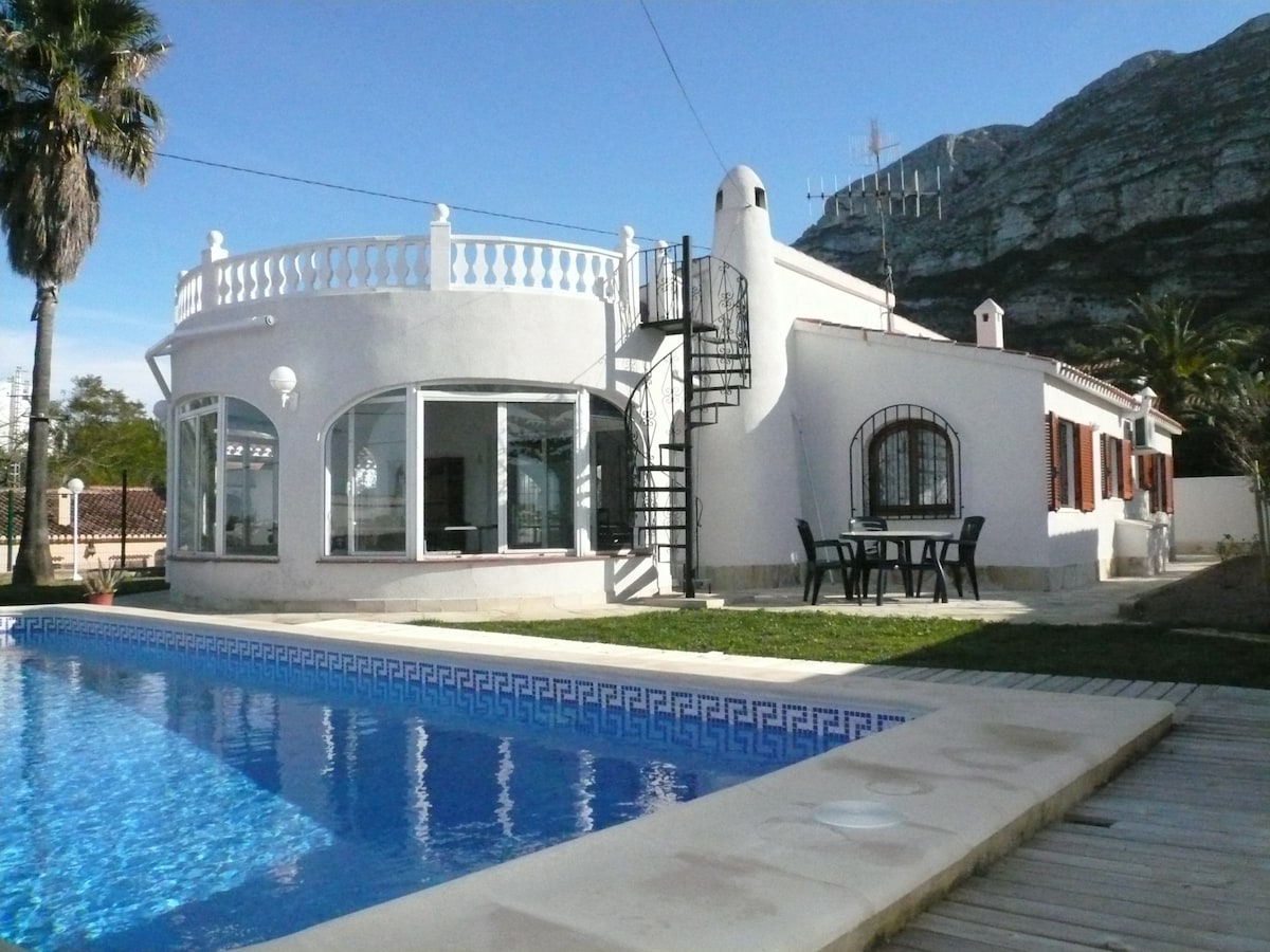 Casa muy privada en zona tranquila a los pies del Montgó con piscina de 13'5x 4'5mts y Jacutzzi. Soleada todo el dia con orientación Sur. A 2 minutos andando a una clínica privada, supermercado,cafetería y restaurantes. 3 minutos en coche al Campo de Golf. Consta de 3 dormitorios, salón amplio con chimenea, cocina totalmente equipada, dos baños . El salón y dos de los dormitorios tienen acceso al porche con vistas a la piscina y paisaje.Toda la casa tiene aire-acondicionado y calefacción.