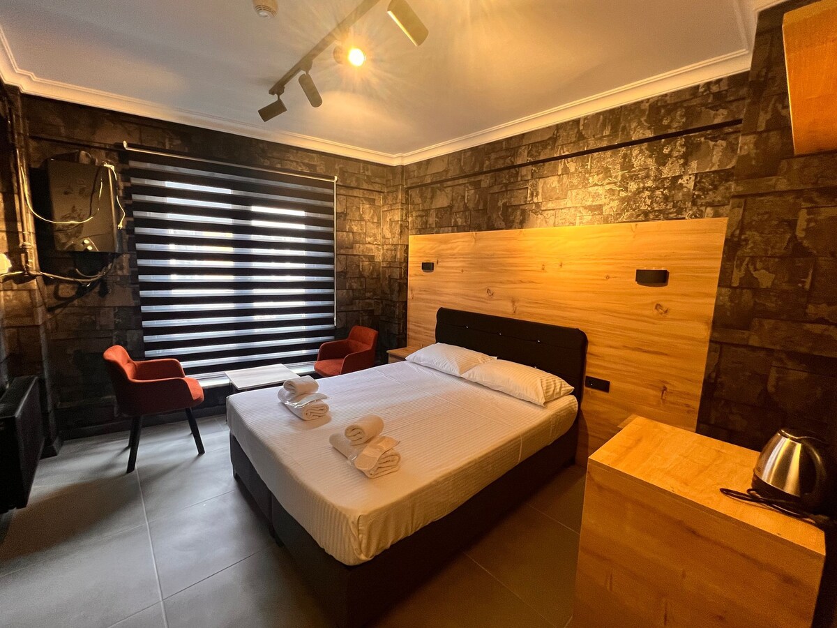 Hello, from a wonderfully restored mansion in the city center! Located in a quiet street close to a lively arts scene and shops for all tastes, Yuva Otel is right next to the most important pedestrian axis of the city and the old town. The rooms impress with their comfort and design. In summer, you can enjoy the sun with the scent of mint plants in the terrace restaurant. This room is located on the ground floor.