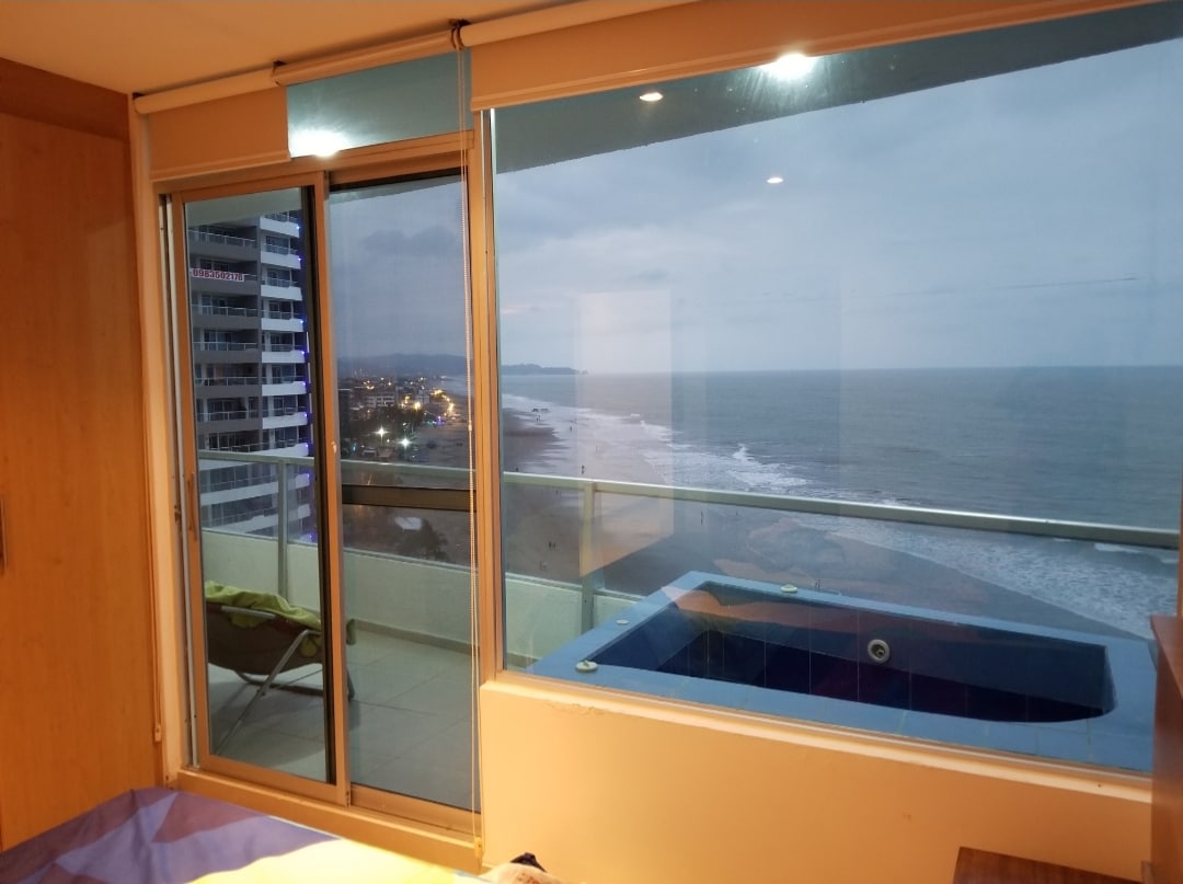 Con una vista privilegiada desde el 9no piso dentro de un Resort cerrado, incluye seguridad las 24 hs, aire acondicionado, El edificio y Resort dispone de generador electrico y cisterna, DirecTV, Carpa y sillas para la playa instaladas, lindo mobiliario, parqueadero cubierto, acceso directo a playa, 7 piscinas, 2 yacuzzis, parques infantiles, canchas deportivas de tenis, futbol, básquet, vóley, golfito, billar y parrilla familiar. *No incluye el costo del brazalete del Resort *