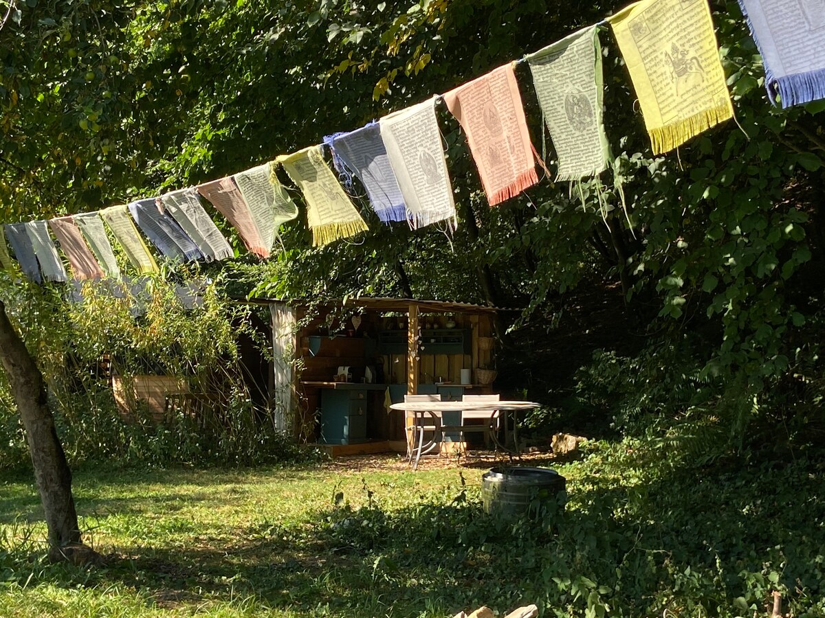 A la felicidad de las almas le da la bienvenida a una yurta Cévenole calentada con estufa de pellets. Ideal para relajarse, este entorno propicio está equipado con cocina al aire libre, ducha de agua caliente al aire libre y aseo seco al aire libre también. Estacionamiento y entrada privada. Situado en la puerta de las Ardenas y cerca del Ravel, es un lugar ideal para practicar senderismo y ciclismo. Bienvenido.