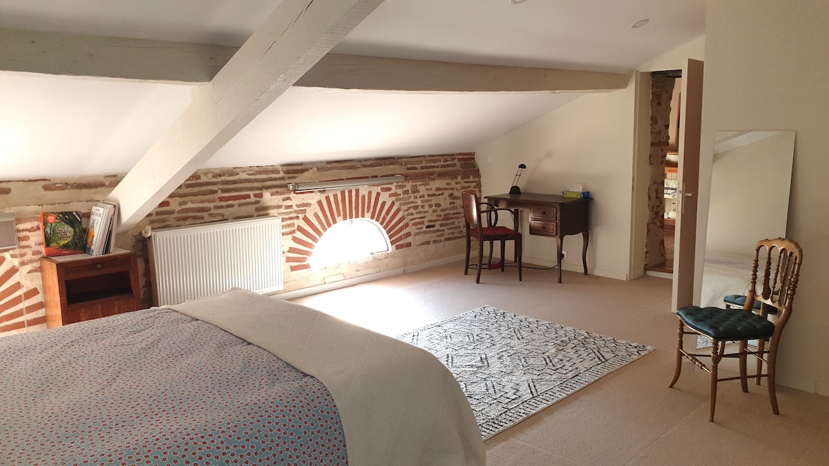 Suite de charme en duplex, attenante maison du Lauragais en briques et galets. Entrée indépendante. Jusqu'à 5 P + BB. Voir site Maison d'hôtes Les Couleurs du Vent. Petit déjeuner maison inclus, essentiellement bio et local. Dîner en sus à partir de 19€. Végé possible. Belle campagne. Balades. Toulouse à 20 kms. Transports en commun. RdC : chambre lit 160. Etage : petit salon, coin bureau, matelas 140 et 90 sur plateforme. Salle d'eau et WC séparés. Suppl. 13 €/nuit pour 2 lits si 2 voyageurs.