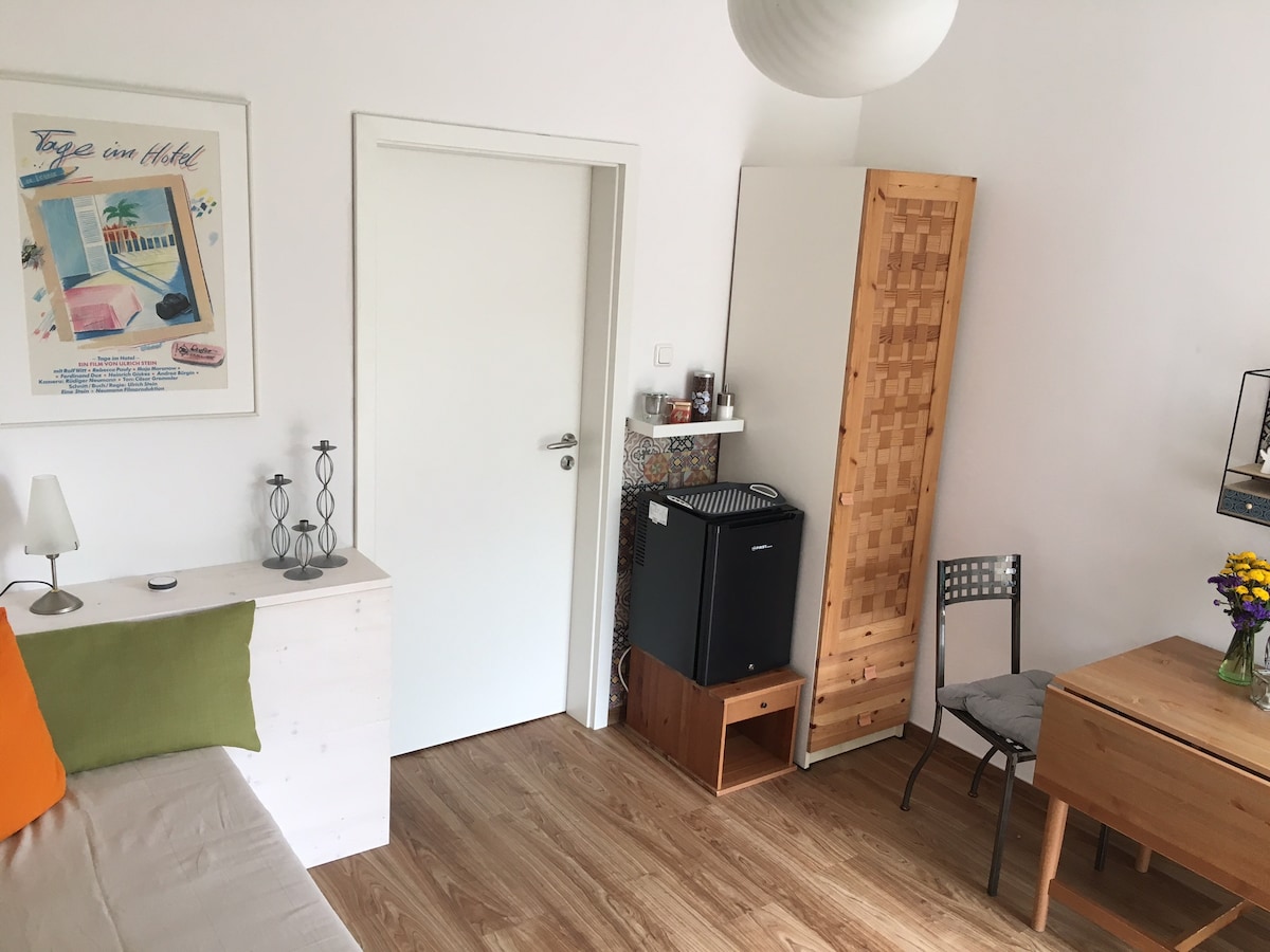 Alquilamos nuestra pequeña habitación de huéspedes (... es UNA habitación, incluso si Airbnb enumera el living y el dormitorio por separado en las fotos) con baño y entrada privados. La habitación tiene una cama de 80x200 cm, que se puede ampliar rápidamente a 160x200 cm. La habitación es de “solo” unos 13 metros cuadrados (más baño), pero por lo demás todo lo que necesitas para una estancia corta: un armario, 2 sillas, una mesa, refrigerador, la posibilidad de hacer café y té... tazas, platos, cubiertos...