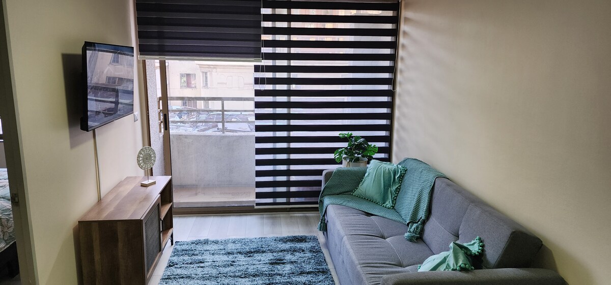Moderno y acogedor departamento con aire acondicionado en el corazón de Santiago. A pasos del metro y del Centro Histórico, rodeado de museos, mercados y restaurantes. Cama king, cocina equipada, balcón y wifi rápido, ideal para viajes o estadías largas. Edificio seguro con conserje 24/7. Atención personalizada, check-in flexible y recomendaciones locales para que disfrutes la ciudad como un residente, con comodidad y tranquilidad.