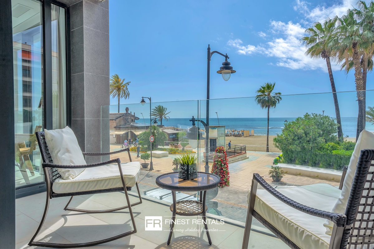 Apartamento boutique de lujo con impresionantes vistas frontales a la playa. Situado en el paseo marítimo de Estepona solo tiene que bajar y esta en la playa. Tiene un amplio y elegante salón comedor, una moderna cocina, un amplio dormitorio de matrimonio, un baño completo y un balcón donde disfrutar de una copa de vino o un rato de sol con las mejores vistas del mar. Al lado de restaurantes, bares de tapas, tiendas, con un parking justo al lado y todo las maravillas de Estepona a un paso.