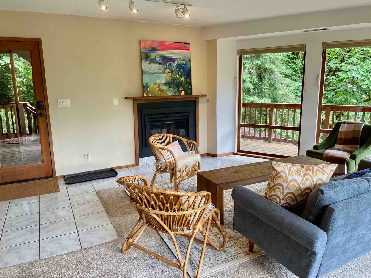 Serenidad, privacidad y comodidad en el exclusivo Eugene South Hills. Ubicada en las copas de los árboles, pero a minutos de la U de Oregón/centro de la ciudad/I-5, esta suite de huéspedes dedicada de más de 900 pies cuadrados de 3 niveles tiene una entrada privada, paredes de ventanas, una chimenea de leña, una bañera de hidromasaje al aire libre, una cama king size, wi-fi, cable/Netflix, auto check-in/check-out, entrada sin llave, nuevo HVAC sin ductos y un masajista disponible. Este es el Airbnb #1 en Eugene utilizado para lunas de miel, escapadas y un video musical.