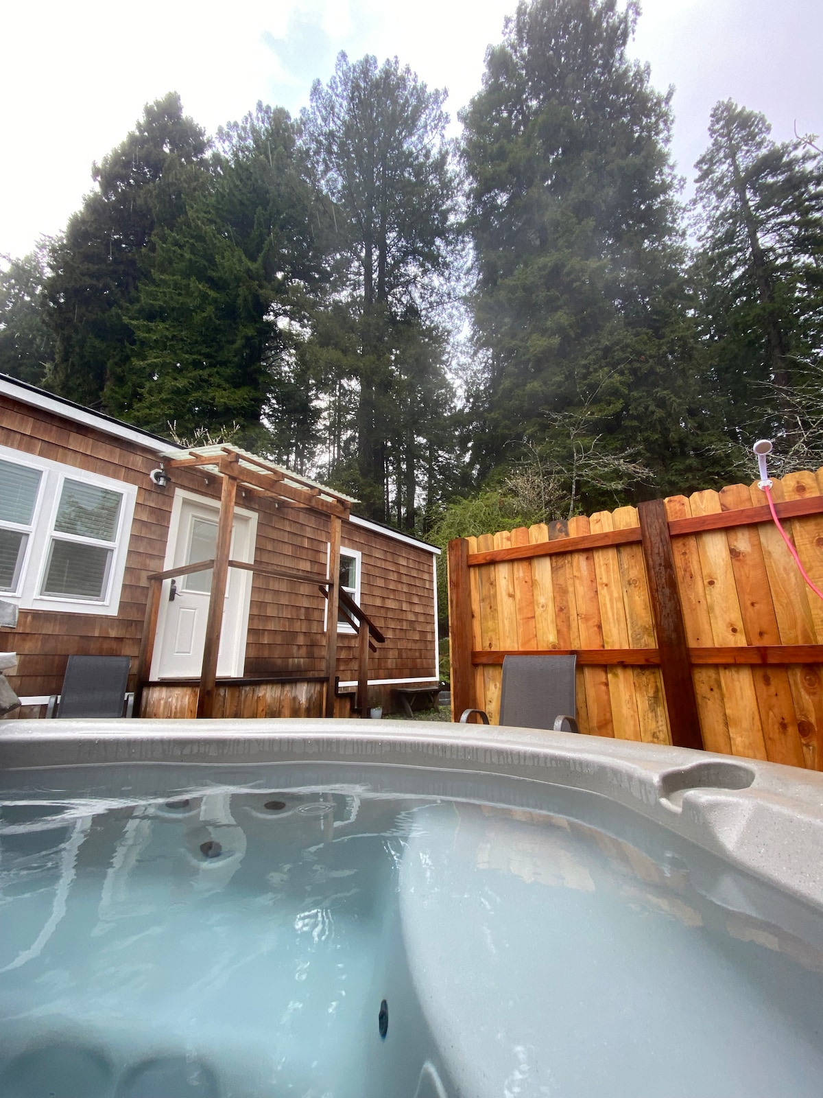 Welcome to your magical getaway in the Redwoods! Please read our guest reviews for the best description of what you’ll experience during your stay here. Our guests say it best! Tiny House in the Redwoods is nestled next to the redwood forest with a private patio space and hot tub in front, a goat pasture in the back, and a private parking spot right outside the door. You can relax on the patio, in the hot tub, or watch the goats frolicking in the pasture while you stroll through the property.