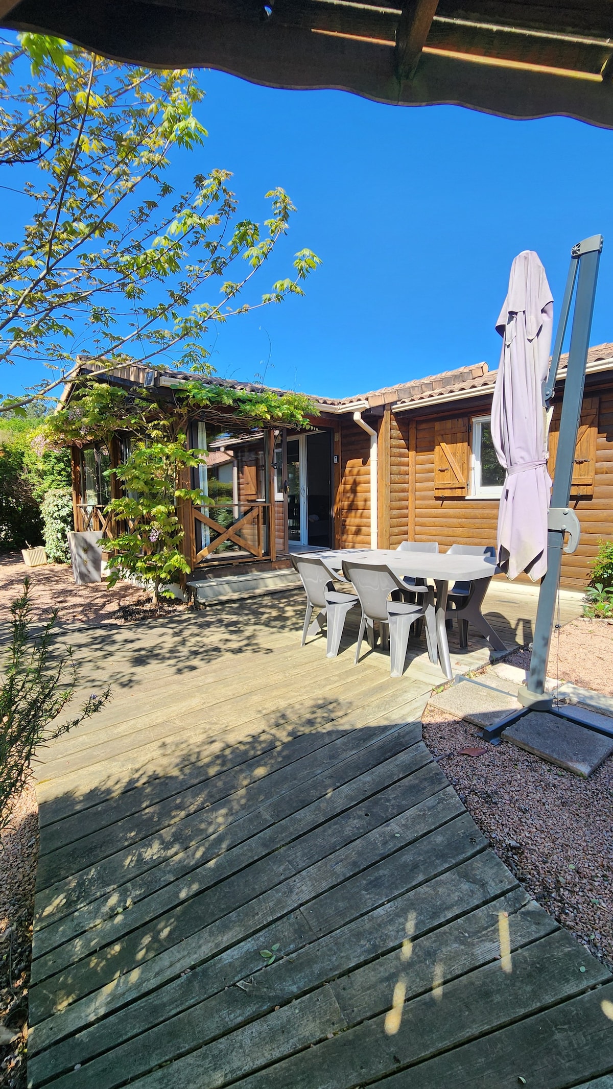 Jolie maison en bois à l’orée de la forêt . Grand jardin, 1 chambre, 1 cuisine équipée, chauffage, TV, canapé, wifi, WC séparé, salle d'eau avec douche, 2 salons de jardin. Jardin clôturé sans vis à vis, vu forêt : tables, chaises, transats, parasol+ terrasse donnant sur la pièce principale salon jardin , plancha, portail accès direct sur un chemin forestier. A 10 minutes et lac Chien bienvenu Possibilité lit bébé Votre lit est prêt à votre arrivée Possibilité forfait ménage 50€