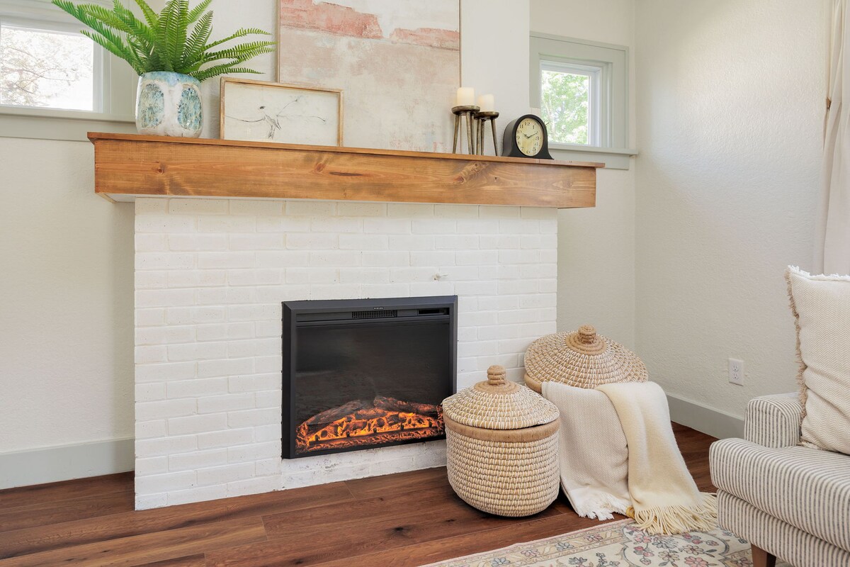 The perfect place to unwind! Master room boasts a super comfy king bed, a stylish built-in wall dresser, cozy fireplace, as well as a riverfront balcony. The Loft is great for lovers of Boho style, queen bed w/ ample space to stretch out for yoga as well as a private crow’s nest balcony! 3rd bed(twin) can be found in a repurposed library room. Take a dip in the jetted jacuzzi tub w/ a sunset view! A full kitchen awaits your cooking needs! Large private dressing/makeup room is a favorite!
