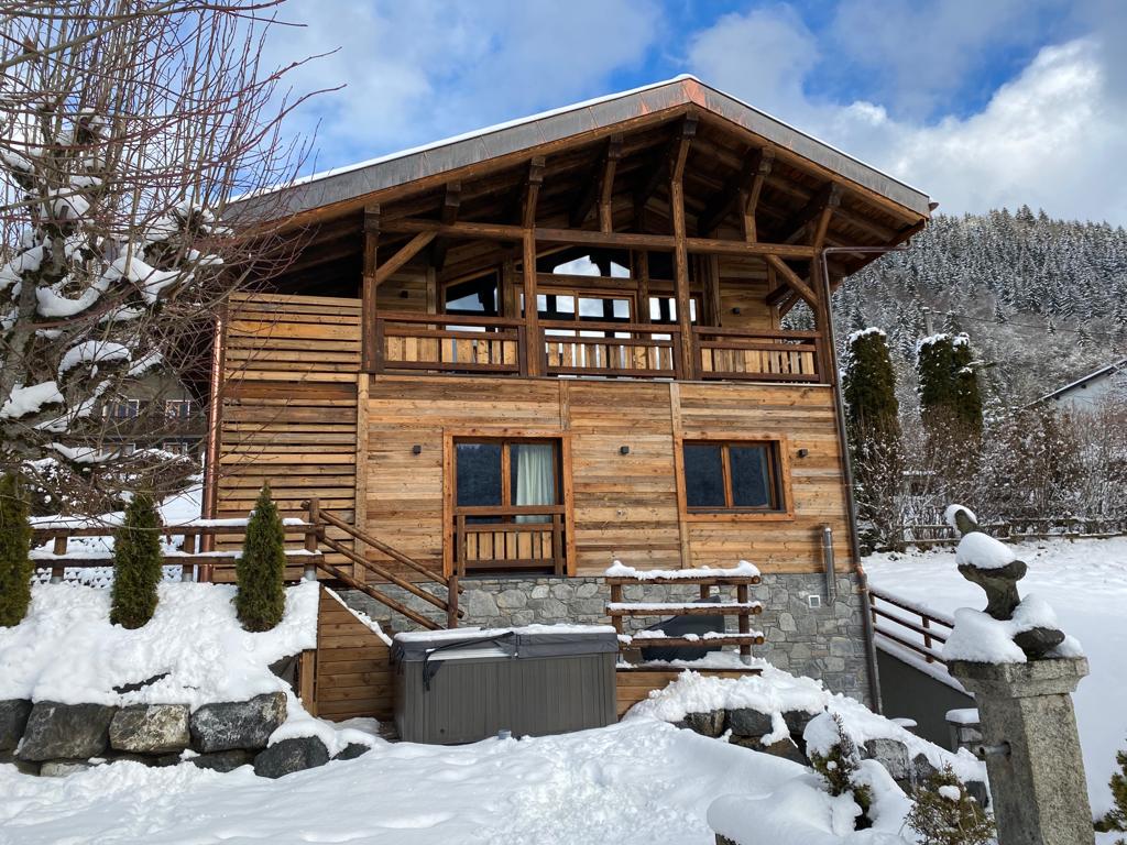 Chalet a las afueras de Morzine con acceso a las pistas de esquí de Portes du Soleil. Capacidad para 10 personas, sala de estar estilo loft, chimeneas acogedoras, vistas impresionantes, jacuzzi, sauna, 3 dormitorios de los cuales 2 habitaciones familiares.