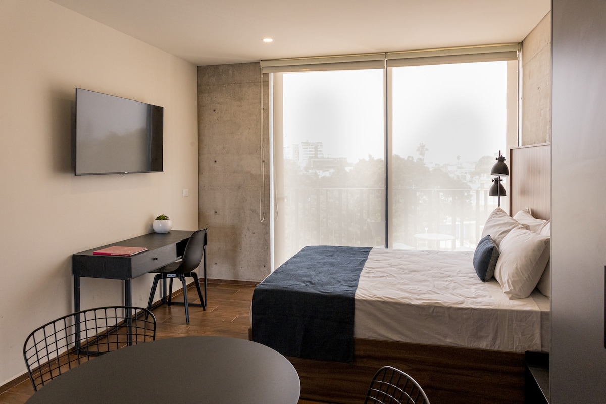 - Acogedor y exclusivo estudio ejecutivo con cama queen-size, escritorio y aire acondicionado. - Balcón para tomar aire fresco. - Cocina equipada. - Ingreso con cerradura inteligente y clave personalizada y exclusiva para cada huésped. - Rooftop panorámico con restaurante en el nivel 9. - Sala de juntas equipada para reuniones profesionales (consultar disponibilidad). - Acceso 24/7 con código personalizado. IMPORTANTE: No contamos con estacionamiento privado dentro de la propiedad.