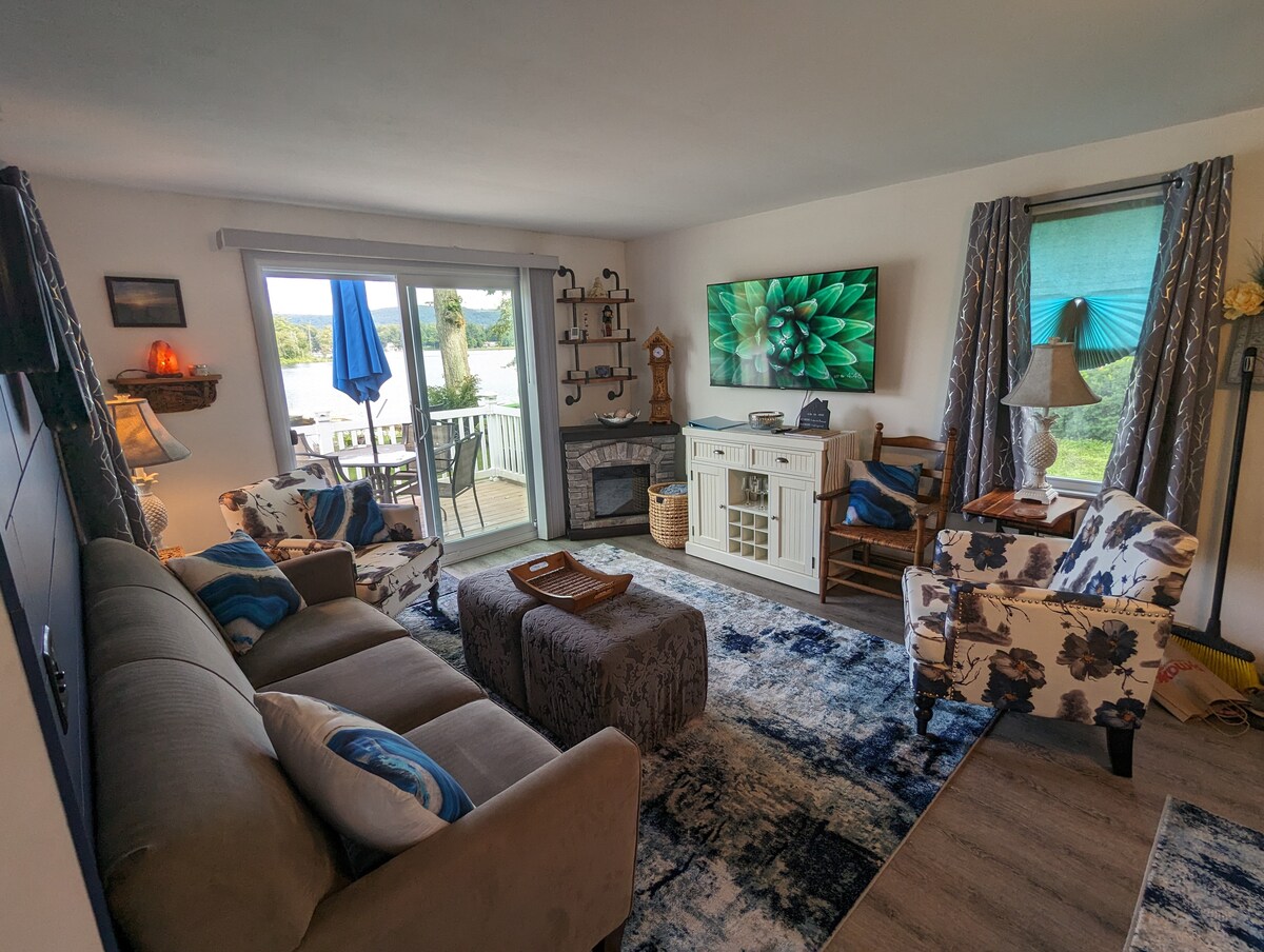 Situada directamente sobre las hermosas aguas del lago Skaneateles. Disfruta de vistas increíbles y paisajes sonoros inmersivos desde una casa de campo rústica de pino nudoso. Ideal para vacaciones en familia pequeña y retiros en pareja. Capacidad para 4-6 personas. Incluye: cocina actualizada, baño, juego de cama tamaño queen, loft para dormir (con cama tamaño queen), sofá modular de 8 piezas, TV, cable, wifi, calefacción, aire acondicionado, agua y hielo. Los patios tienen asientos para comer, tomar el sol, litera cubierta con red, muelle para barcos, muelle para nadar (junio-septiembre), parrilla de gas, columpio grande, 4 kayaks y una tabla de remo.