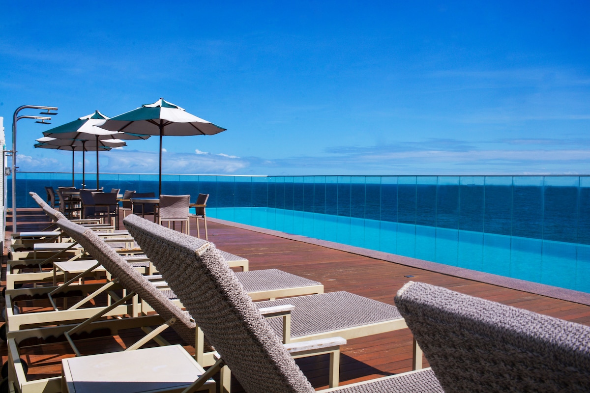 Estudio moderno y acogedor (36 m²) con cama doble, sofá cama, TV inteligente, aire acondicionado, cocina equipada, bañera y Wi-Fi rápido. Ubicado en el Corredor da Vitória, el barrio más exclusivo de Salvador, en Sol Victoria Marina (hotel de 4 estrellas), con acceso al muelle privado, con un tobogán acuático, además del restaurante Mahi Mahi, junto al mar. En la calle hay museos, mercados, cines y gimnasios. Acceso gratuito al muelle solo para huéspedes. Departamento con vista al Corredor da Vitória.