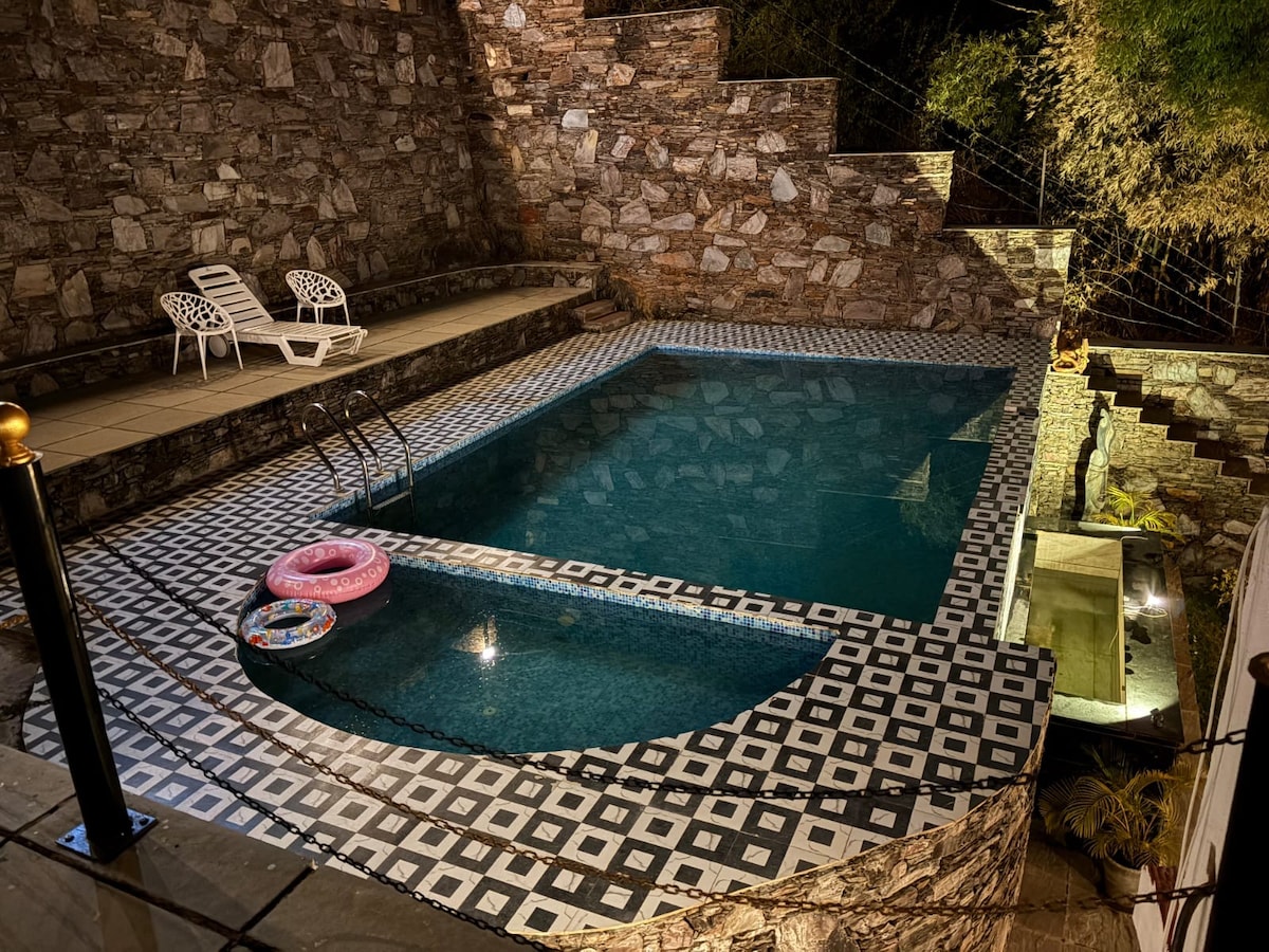 Jungle-themed Bagh Haveli :Pool swing & Hill View