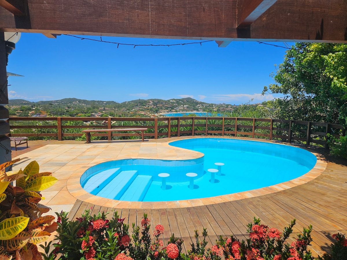 Casa de sonho com linda área social com piscina, sauna à vapor, terraço com linda vista e espaço agradável coberto com churrasqueira e lavabo. Com duas salas de estar, sala com TV de 70 pol., cozinha completa com sala de jantar, lavabo e quatro confortáveis suítes. A casa tem uma vista do mar fantástica! Perto de quatro praias e da Orla Bardot, que leva à pé à Rua das Pedras. Casa extremamente charmosa e sofisticada! Acomoda um máximo de oito adultos e quatro crianças (até 12 anos de idade).