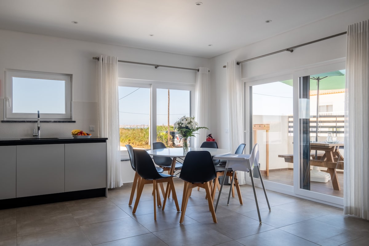 Villa con 260 m2, excelente exposición al sol y grandes áreas, se encuentra en Quinta das Palmeiras, a 800 metros de la playa, a 400 metros del supermercado, comercio tradicional, restaurantes, cafeterías y bares, tiendas y escuelas de surf, en una calle tranquila con vistas panorámicas. Ideal para familias con niños pequeños o grupos de amigos. Los huéspedes pueden disfrutar de fácil acceso a todo, desde este espacio céntrico, muy cómodo y acogedor, con excelentes áreas comunes y privadas.