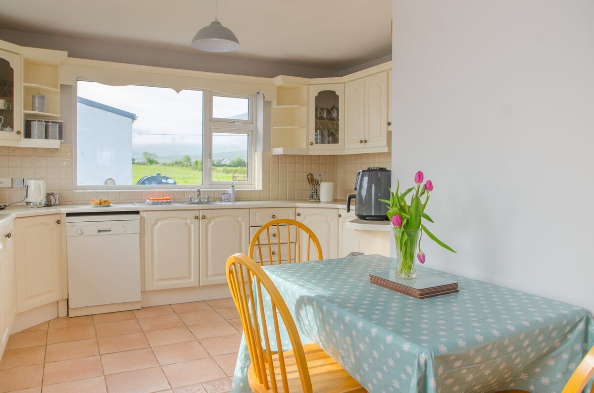 House is in the beautiful Countryside approximately 10 mins drive from Killarney Town and National Park/INEC. Breathtaking views of Carauntoohill/Reeks Mountain,Gap of Dunloe all from the property. It is the perfect location to discover the Southwest of Ireland on the main route of the famous Ring of Kerry, Wild Altantic Way and Dingle .The House is a 2 min drive from R563 Killarney to Dingle road, Killarney Golf Course 10-15 min drive. Local Shops 5min drive, 15 min Kerry Airport, beaches 30min