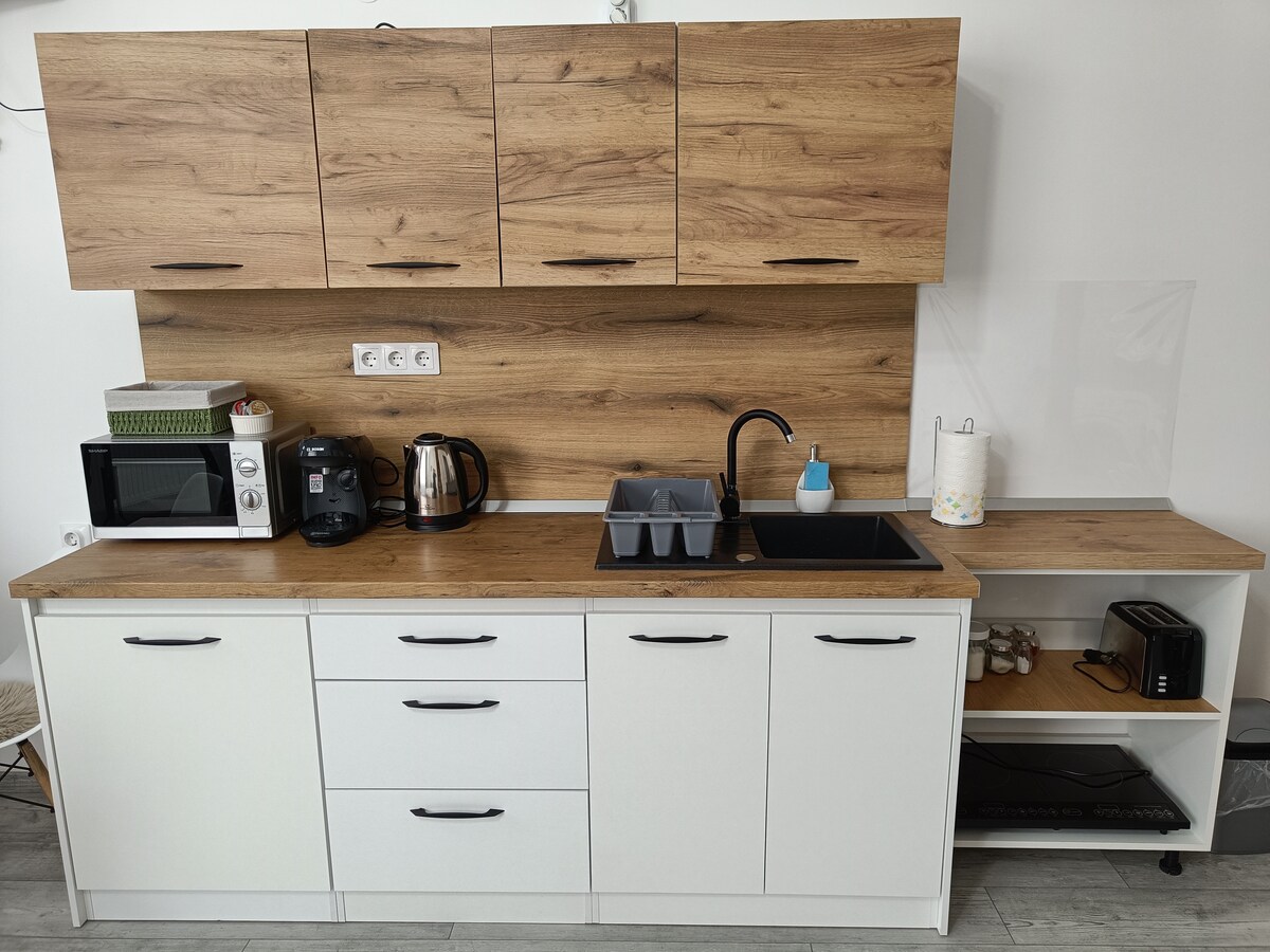 El estudio está ubicado en la orilla de Mures, cerca del centro. El centro de la ciudad se encuentra a una distancia de 1500 metros. La sala multiusos está a 500 metros de distancia. El estudio tiene una entrada independiente desde la calle. Tiene una superficie de 35 m2 compuesta por un espacio abierto +baño y una galería de 4 m2. Cuenta con una cama tamaño queen y un colchón para dos personas en la galería.
