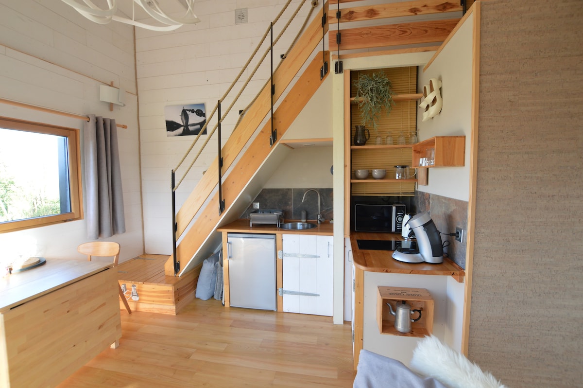 ¡Nuestra última adquisición es una caravana inspirada en las Shepperd's Hut inglesas! Un pequeño y acogedor nido diseñado con 9 esencias de madera diferentes que se entrelazan para crear un ambiente acogedor junto a la estufa. Pequeño espacio para dos, funcional con todas las comodidades de uno grande, un rincón cálido y luminoso para descansar de ahí su nombre en inglés de nook. Un jardín protegido de las miradas y del viento para disfrutar del tiempo y relajarse después de un día de exploración.
