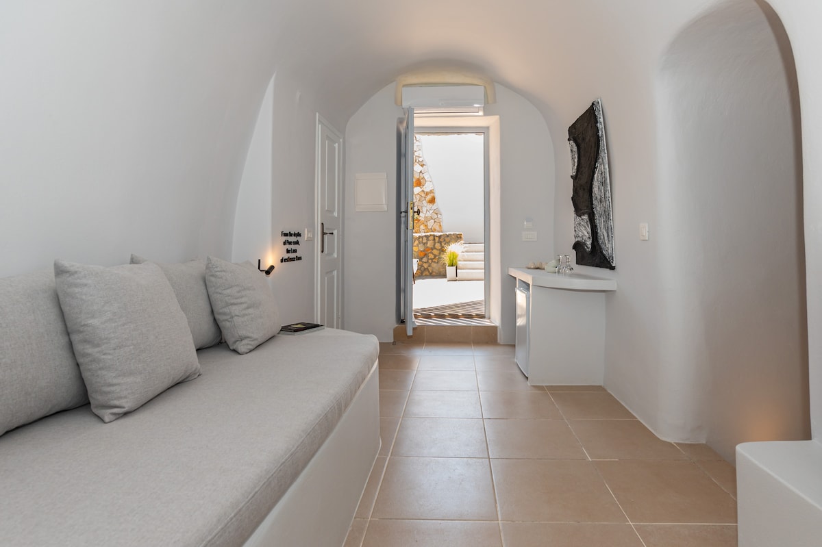 Akron Cliff Suite es una suite tradicional en una cueva en el corazón de Fira, la vibrante capital de Santorini. Ubicada en el borde de los acantilados de la icónica caldera, la suite Akron Cliff ofrece vistas panorámicas del mar Egeo, el volcán histórico y las espectaculares puestas de sol de Santorini, todo desde tu terraza. Nuestra ubicación privilegiada en el centro de Fira significa que está a pocos pasos de encantadoras tiendas, restaurantes y la vida nocturna de la isla, pero perfectamente ubicado para la tranquilidad.