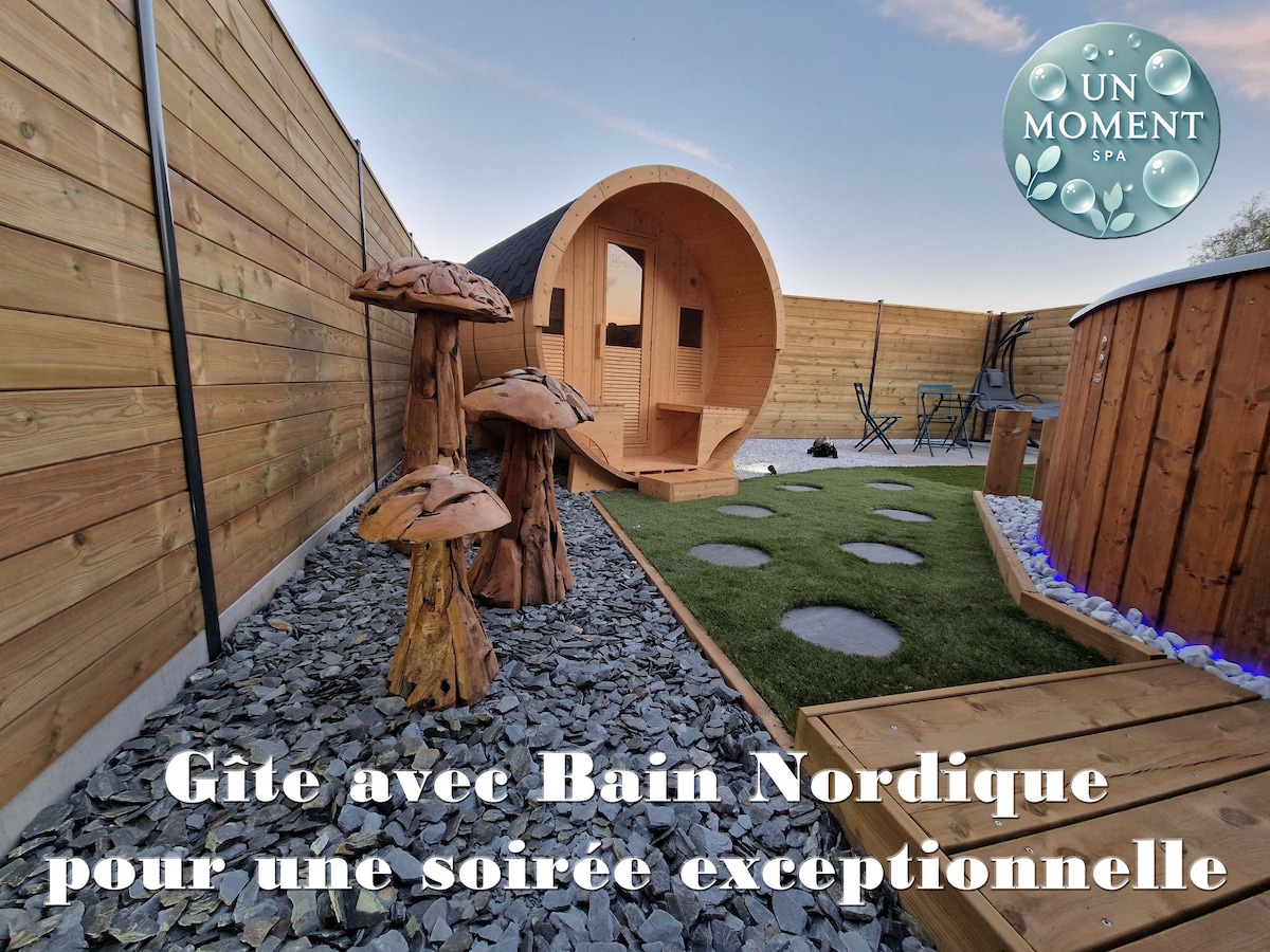 Sumérgete en el ambiente agradable de la casa rural Le Nordique, que ofrece una superficie interior de 100 m², perfecta para relajarse y divertirse. Disfrutá del baño nórdico de 10 plazas y del sauna exterior, ideales para un momento de relax al aire libre. Descubrí un salón cálido equipado con un televisor de pantalla grande, una mesa de billar, una máquina recreativa y un juego de dardos para compartir momentos inolvidables. La habitación le da la bienvenida con una cama redonda de 220 cm, que combina comodidad y originalidad.