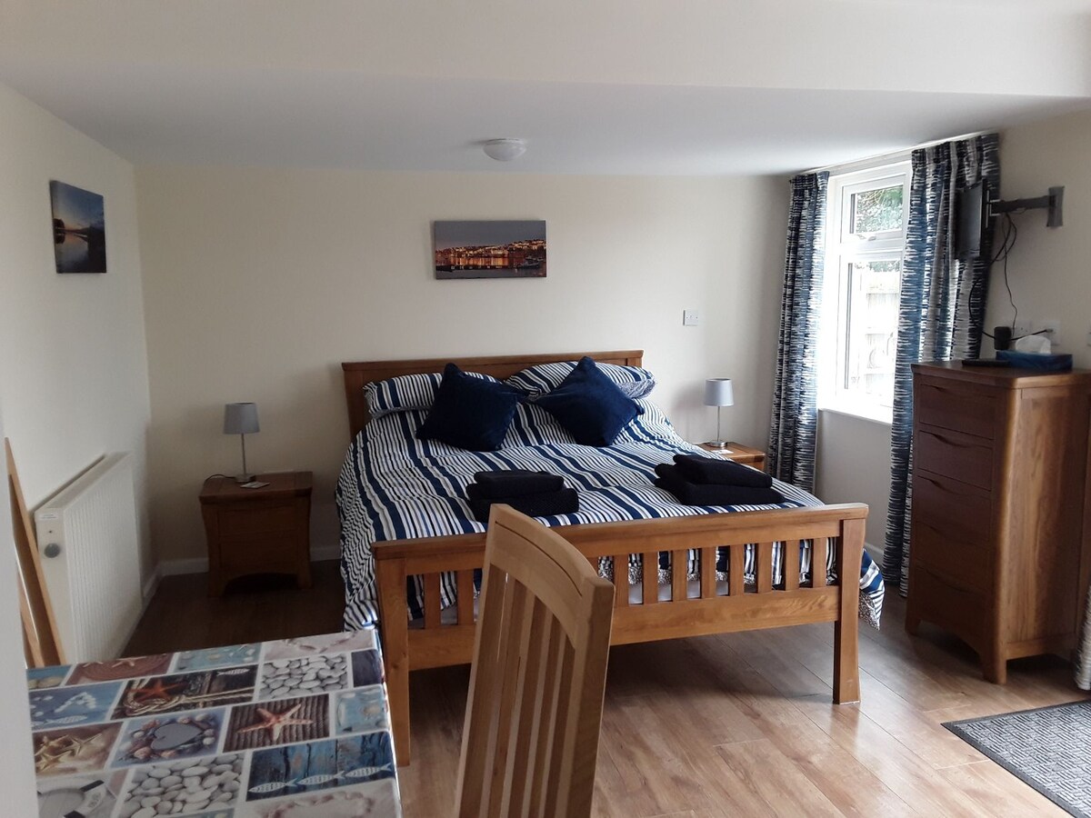 Un anexo tamaño king elegantemente amueblado con su propia entrada privada. La habitación está en la parte trasera de nuestra casa victoriana con su propio baño con ducha y espacio privado al aire libre. Se encuentra en el centro de Falmouth, cerca del centro de la ciudad, las playas, las estaciones y algunos de los edificios del campus universitario. Es ideal para parejas, padres que visitan a sus hijos en la universidad y viajeros de negocios. El aparcamiento en la calle es gratuito. Sauna de jardín disponible bajo petición de octubre a marzo por 15 £/hora.