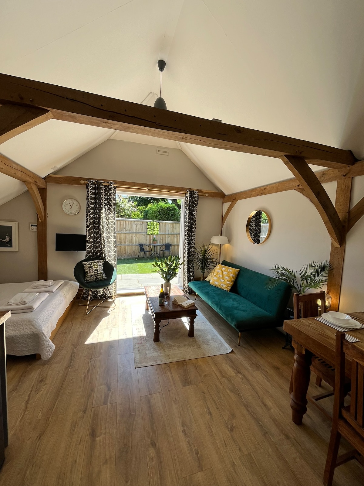 This stylish place to stay is perfect for couples looking for a country get away with walks across the fields. Driving distance to local amenities, pubs/restaurants & attractions. Weald Lodge is a separate annexe in the gardens of Wealdview Farmhouse (TN12 6SP) PLEASE NOTE, despite being in the category of farm, we are not a farm and do not have far machinery. The fields around us have grazing sheep Due to the open beams on the mezzanine level, we don't encourage infants or children