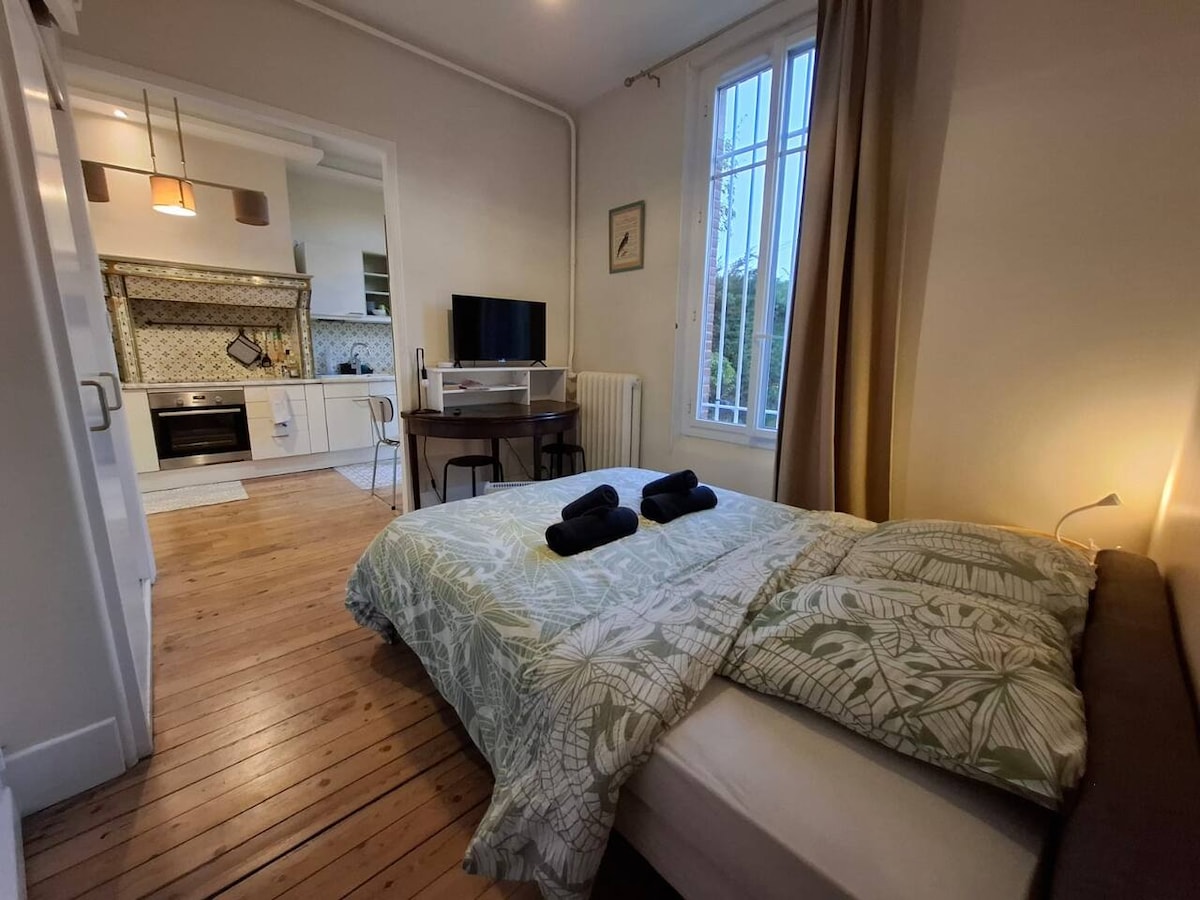 Relájese en este alojamiento tranquilo y elegante. Situado en las inmediaciones de Mondonville, cerca de Toulouse (a 25 minutos de la estación de tren), Airbus (a 7 minutos), el MEET y el bosque de Bouconne (a 3 minutos). Nuestro T2 de 43 m², reformado con buen gusto, acogedor, funcional e íntimo, le seducirá. Wifi, cocina funcional, baño grande, tv en la habitación, luz regulable, aire acondicionado reversible, sofá cama. Recientemente renovado. Cerca del centro comercial (5 minutos andando) y transportes. ¡Café gratis!