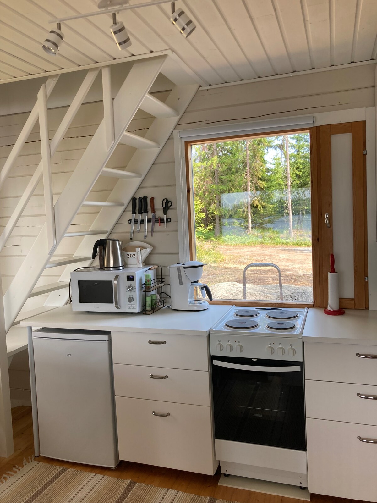 Hermoso y tranquilo destino vacacional a orillas de un lago de aguas cristalinas. La cabaña tiene una sala de estar con cocina. Junto a la cocina, un nicho con una cama de 140 cm. En la sala hay un sofá cama para dos. En la planta superior, que no es de altura completa, hay dos colchones. En la sala hay una chimenea y una bomba de calor de aire. La cabaña tiene una sauna calentada con leña, y el agua de lavado se calienta cuando se calienta la sauna. El agua potable y para uso doméstico llega al patio. Inodoro de compostaje. Barco de remos y tabla de surf de remo a disposición del inquilino. Chalecos salvavidas/flotadores disponibles de 20 a 90 kg.