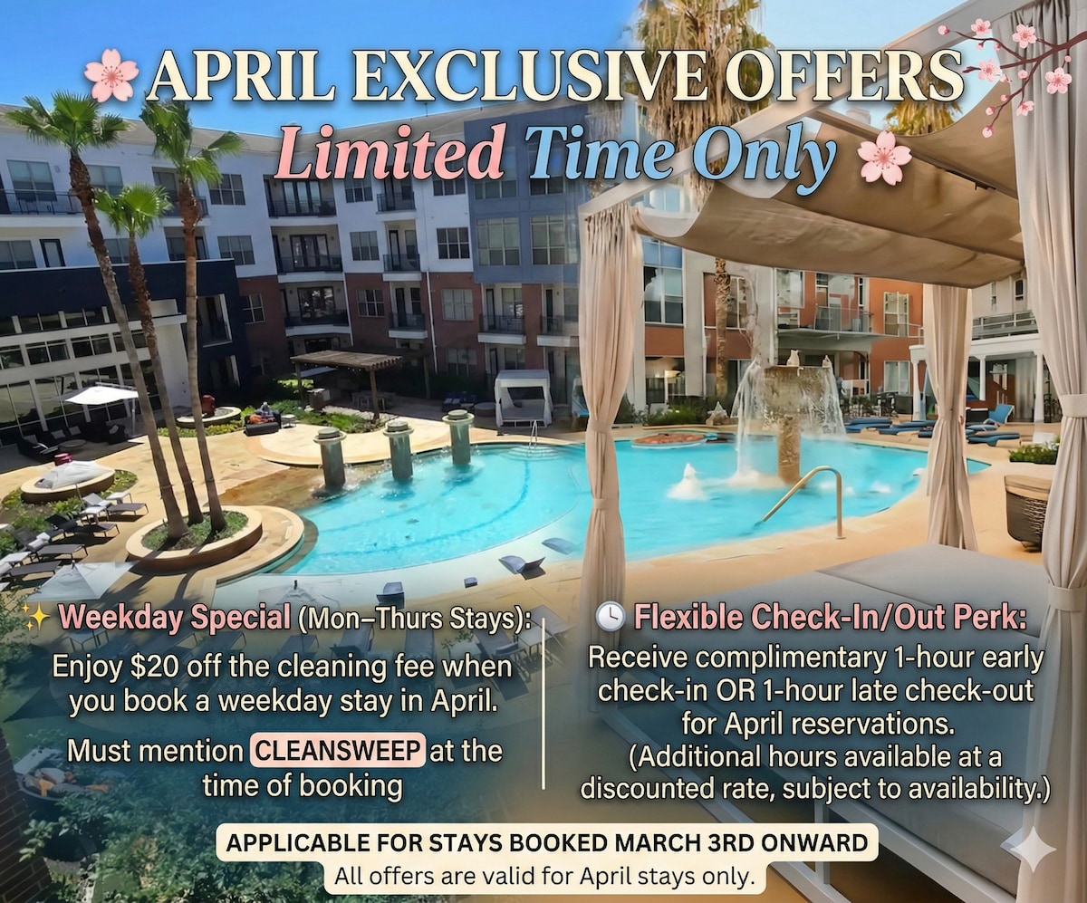 ✨ Luxury King Suite • Balcony Pool View • Steps to Galleria ✨ Escape to your private Uptown retreat just steps from the Galleria. This modern apartment features a plush King bed, a Sofa Bed Couch, a private balcony with sparkling pool view, and a sleek open kitchen for easy meals. Stream movies with fast Wi-Fi, or unwind in hotel-quality linens. Self check-in & free garage parking make every stay smooth. Perfect for business trips, medical visits, or a stylish getaway in Houston’s best district