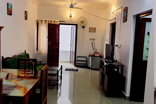 Este apartamento amueblado de 51 metros cuadrados se encuentra en el segundo piso. El apartamento tiene una amplia sala de estar, cocina pequeña y un dormitorio con aire acondicionado con baño adjunto y un balcón con vistas a la calle. El desayuno que se ofrece es casero y de cocina tradicional de Kerala. Nuestra promesa es proporcionarte tanto cuidado, comodidad y paz como tendrías en un hotel con estrellas, con el toque personal y sociable que es sinónimo de Home Stays.