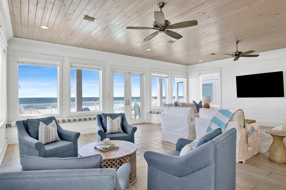 Quarter Deck, un impresionante alojamiento vacacional en las costas de arena blanca de la isla Dauphin, Alabama. Esta casa de playa, que lleva el nombre de sus fuertes lazos con la Marina, cuenta con 213 metros cuadrados de espacio lujoso con cuatro dormitorios espaciosos, cada uno con un baño privado. Disfrutá de los muebles de primera línea de Pottery Barn y una gran mesa de comedor familiar. Las áreas al aire libre incluyen más de 2000 pies cuadrados de terraza cubierta, una terraza descubierta y una piscina vallada con una terraza de gran tamaño.