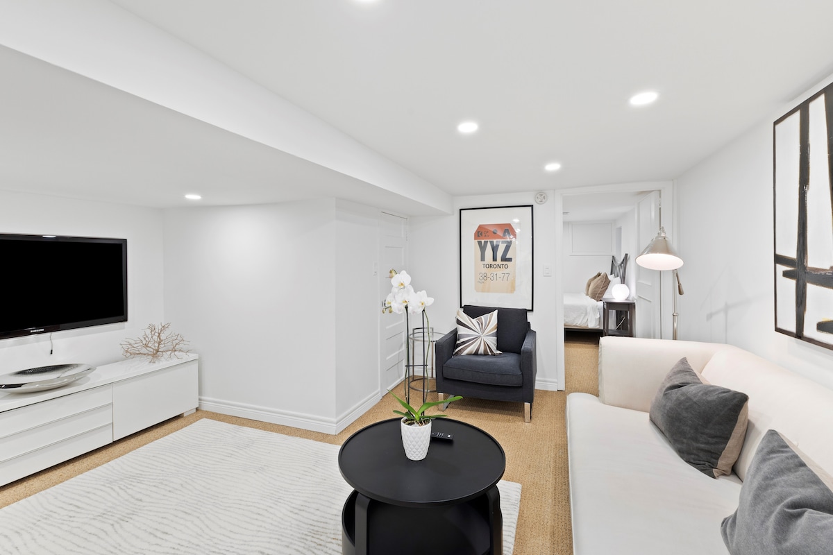 Situado en el codiciado barrio de Roncesvalles, este luminoso apartamento en el sótano de 1 dormitorio es la opción perfecta. Con el TTC a pocos pasos, puedes acceder fácilmente a ambos aeropuertos y al corazón del centro de Toronto. Roncesvalles es un pueblo vibrante con tiendas, comestibles y restaurantes a la vuelta de la esquina. Estás a 10 minutos a pie del lago Ontario y del hermoso High Park. Este espacio ofrece una cama tamaño queen, un armario espacioso, una cómoda sala de estar, cocina y estacionamiento. Ven a disfrutar