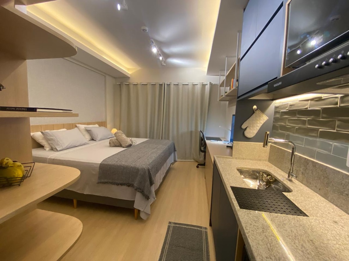 Disfruta de una experiencia elegante en este lugar bien ubicado. Encantador, bellamente decorado y acogedor estudio con espacio de garaje en un edificio con piscina en la azotea. Ayuntamiento, lavandería, biblioteca de juguetes, gimnasio y tienda Pão de Açúcar Minuto (minimercado) en la planta baja. Con la opción de cerrar/abrir el vidrio del balcón en un aire de casa con la seguridad de un condominio. Muchos gabinetes y utensilios domésticos dan al huésped la sensación de estar en casa. Wifi VIVA FIBRA 600 Mbps.