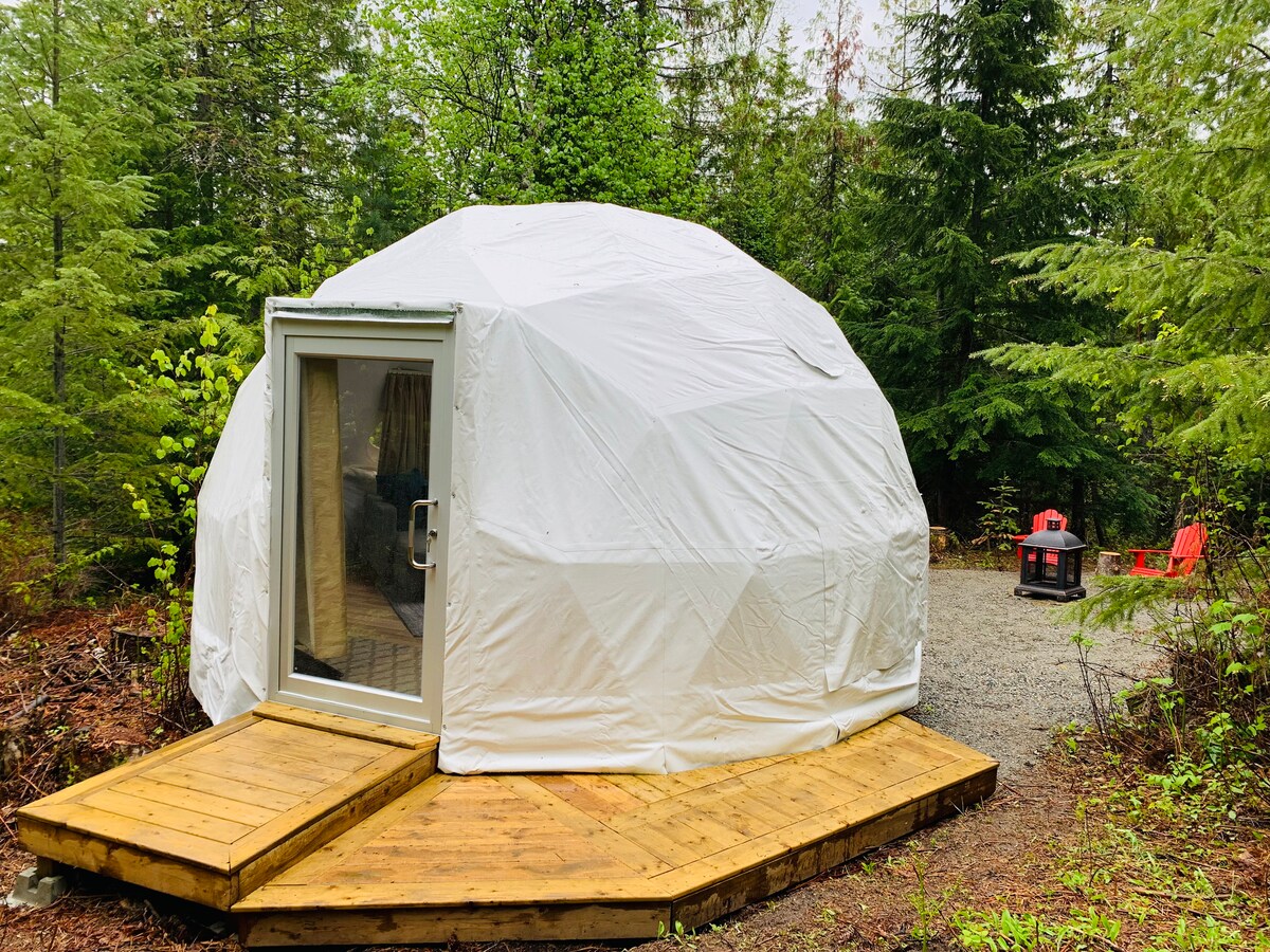 Romantic Geodome glamping at it’s best! Gaze at the sky as you drift off to sleep in our private and peaceful *off-the-grid* Geodome in the North Shuswap. Our private acreage is mostly undeveloped so you can get back to nature and enjoy an uncrowded piece of Shuswap Paradise. Short 2 min drive, 30 minute walk, to a public beach. Geodome glamping is great If you are comfortable with back country camping and looking to reconnect with nature but to be clear it is essentially a tent in the woods.