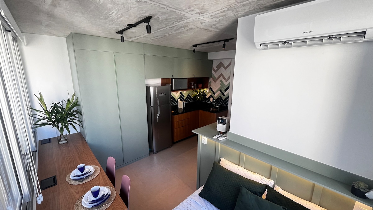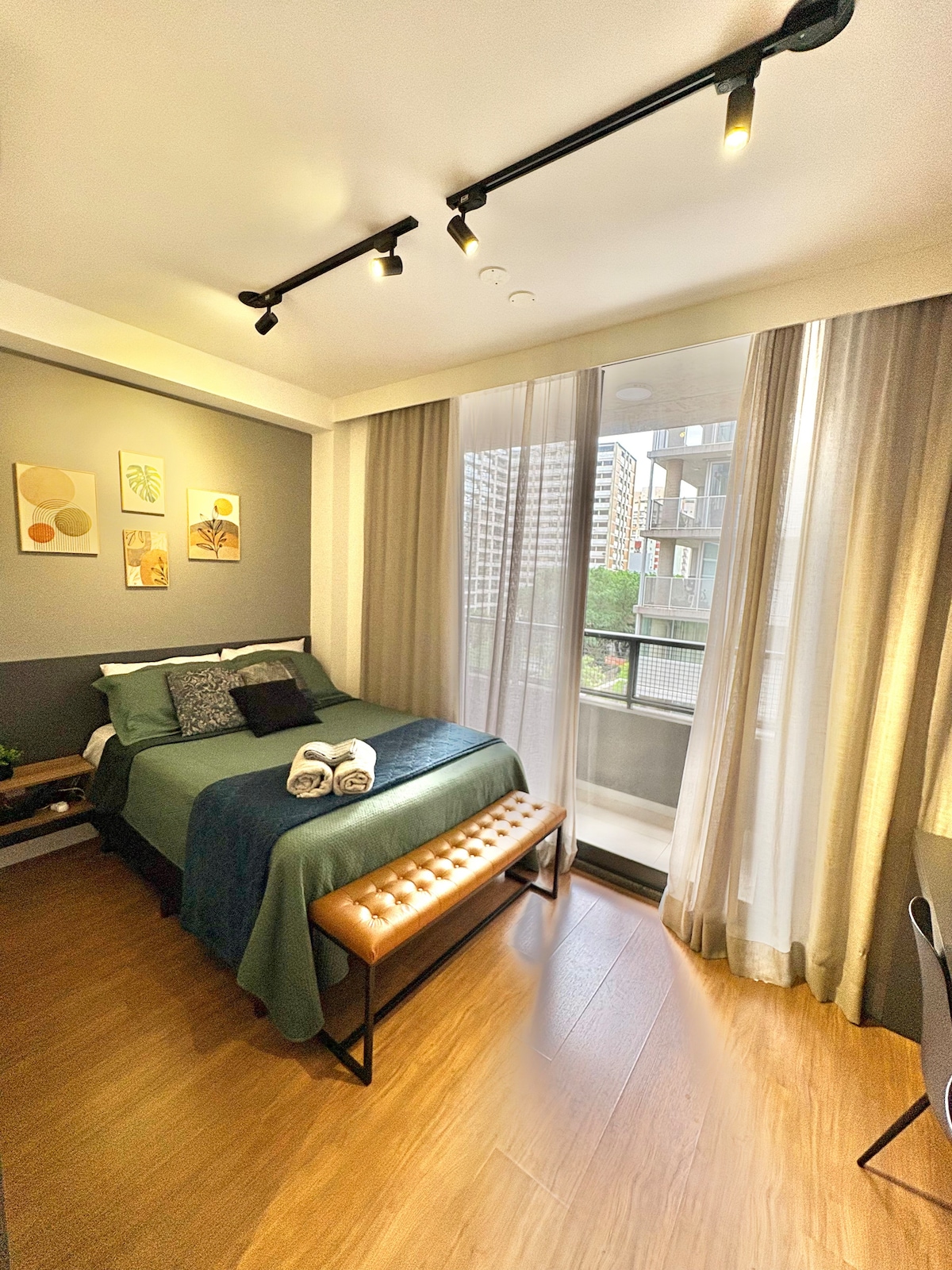Alójese en un estudio nuevo, acogedor, cómodo, moderno y con estilo, situado a menos de un minuto a pie del Shop. Frei Caneca El estudio cuenta con: una cama extremadamente cómoda, aire acondicionado potente que enfría todo el espacio rápidamente, wifi, smart tv con un amplio paquete de canales por cable y aplicaciones de streaming, iluminación toda en led (incluyendo colores en la cabecera de la cama y en el baño con bluetooth y altavoz); cocina completa, balcón y piscina en la azotea.