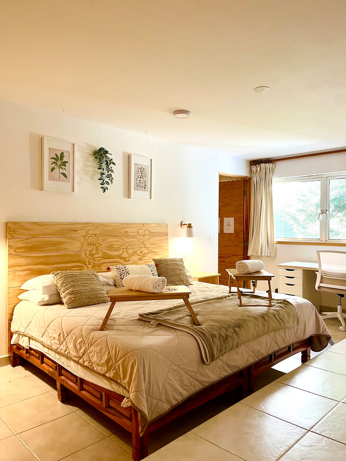 Jardín de tradiciones, ubicado en un edificio porfiriano en Roma N, decorado con referencias a tradiciones méxicanas. Cuenta con: baño espacioso y equipado; lavadora estratégicamente ubicada; cocina equipada con parrilla, microondas, y refrigerador; comedor con mesa y sillas para cuatro personas; Sala de estar con sofá y sillas para relajarse. Habitación principal con cama king-size, ropero, TV y aire acondicionado. Acceso al jardín desde la sala y la recámara. Ideal para estancias prolongadas.