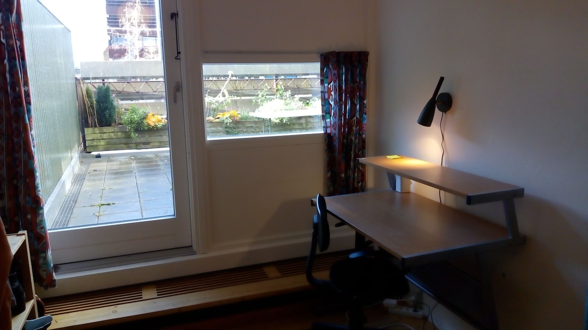 Slap af i denne unikke og rolige bolig. Her er højt til loftet, masser af lys og en fremragende udsigt. Bo godt med skøn dobbeltseng på hemsen og dejligt køkken og stue ud i et - som i en rigtig "New Yorker" lejlighed. Fint badeværelse med alt hvad I behøver og et unikt råt køkken. Det jeg elsker mest ved min lejlighed er, at den er lun og fuld af lys. Ingen kan kikke ind, så man kan gå rundt som man vil. Og så er det så hyggeligt at sove på hemsen. Her får du en særlig oplevelse.