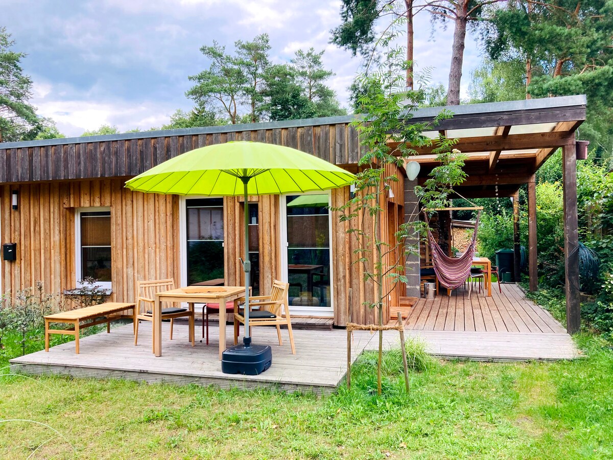 La hermosa casa de madera de diseño en Märkische Schweiz (a 50 km de Berlín) se encuentra en el pequeño pueblo de artistas de Ihlow y ofrece una hermosa vista de los campos y bosques en 65 m2 de espacio habitable con una gran ventana frontal y 35 m2 de terraza cubierta. Hay una gran sala de estar, comedor y cocina con estufa de leña, así como dos dormitorios y un baño. Ambos dormitorios tienen calefacción por infrarrojos. Cada dormitorio tiene una cama tamaño queen (1,60).