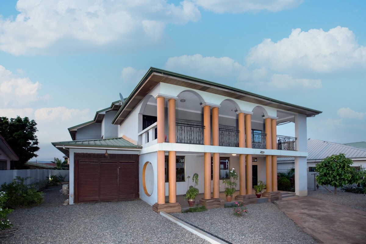Te damos la bienvenida a una villa tropical 🌴 ghanesa verdaderamente única que te da la bienvenida a ti, a tus familiares, amigos o colegas. La villa cuidadosamente diseñada en 2024 con 5 dormitorios y 3,5 baños modernos ofrece una experiencia enriquecedora. Desde el moderno diseño ghanés hasta los servicios personalizados y la máxima privacidad🏡. La villa está ubicada tranquilamente entre East y North Legon, cerca de la Universidad de Ghana🏫, lo que la convierte en una gran base para explorar la ciudad. Las instalaciones de comestibles también están disponibles cerca.