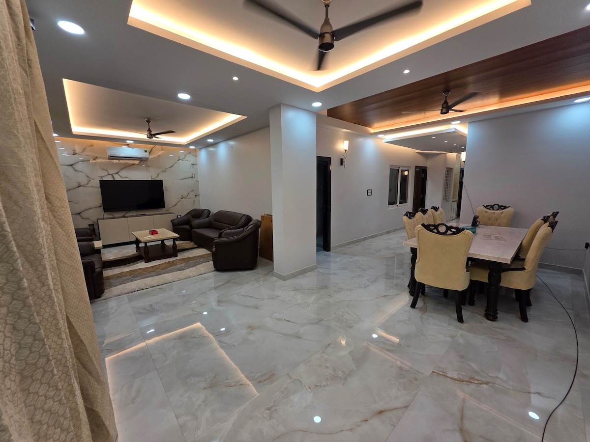 ¡Nuestra propiedad es lujosa, aislada y a solo 5 minutos de Hi-Tech City! Este apartamento dúplex en los pisos 4.º y 5.º es perfecto para: - Grupo de amigos (hasta 16 personas), compañeros de trabajo o familias que celebran una ocasión especial en el césped. - Equipos corporativos que necesitan estaciones de trabajo, wifi rápido y energía de respaldo - NRI, turistas e invitados a bodas que buscan un segundo hogar con SERVICIO DE LIMPIEZA, cocina completa y comodidades modernas. - Parejas que necesitan una escapada para relajarse frente a un televisor inteligente 4K de 55 pulgadas.