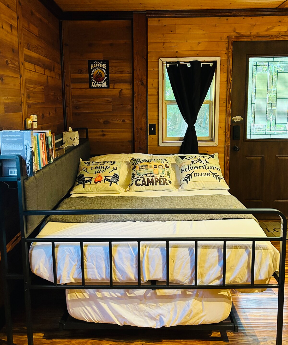 Nestled at the edge of the woods, our cozy studio cabin is the perfect place to slow down, unwind, and enjoy the simple beauty of nature. Secluded and tranquil and still only minutes to Fenton/Holly. Whether you’re sipping morning coffee on the porch, stargazing by the campfire, or curled up inside with a good book, our cabin offers a peaceful year-round retreat. Private and cozy- sleeps 3 in a comfy trundle bed, with a full bath, kitchenette and a 50” smartTV with free streaming options.