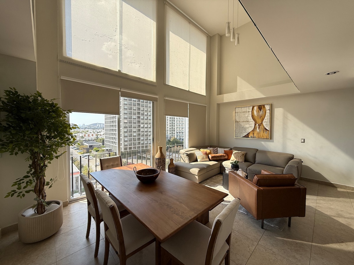 Vive una experiencia única en este acogedor y moderno departamento, perfecto tanto para viajes de trabajo como de descanso. Terraza privada con una vista espectacular de la ciudad. Estacionamiento techado y seguridad 24/7 para que estés siempre tranquilo. Ubicación privilegiada, a solo 5 minutos de Los Arcos y cerca de los principales puntos de interés, restaurantes y centros de negocios y entretenimiento. Haz de tu estancia algo especial, ya sea por unos días o una temporada. ¡Te esperamos!
