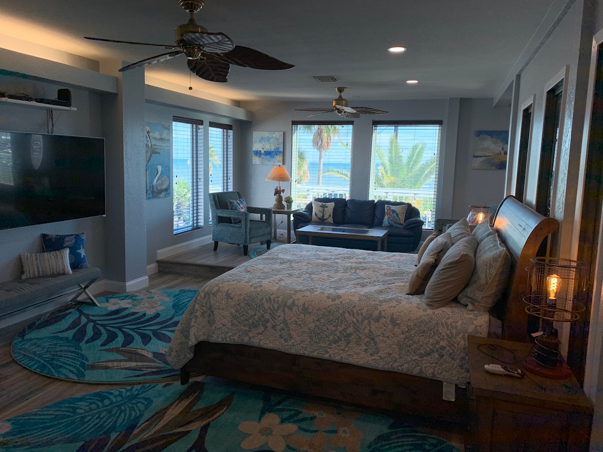 Esta suite estudio de concepto abierto de más de 1200 pies cuadrados abarca todo el segundo piso de la Roomers House, con increíbles vistas al golfo, al muelle de recreo y al malecón. Esta suite cuenta con cocina completa, baño increíble (con gran ducha a ras de suelo), lavadora/secadora, TV de 65 pulgadas con Hulu Live TV, aire acondicionado mini split ajustable, wifi de alta velocidad, dos terrazas privadas, aparcamiento privado asignado y capacidad para 4 personas con dos camas tamaño king con la parte superior acolchada.