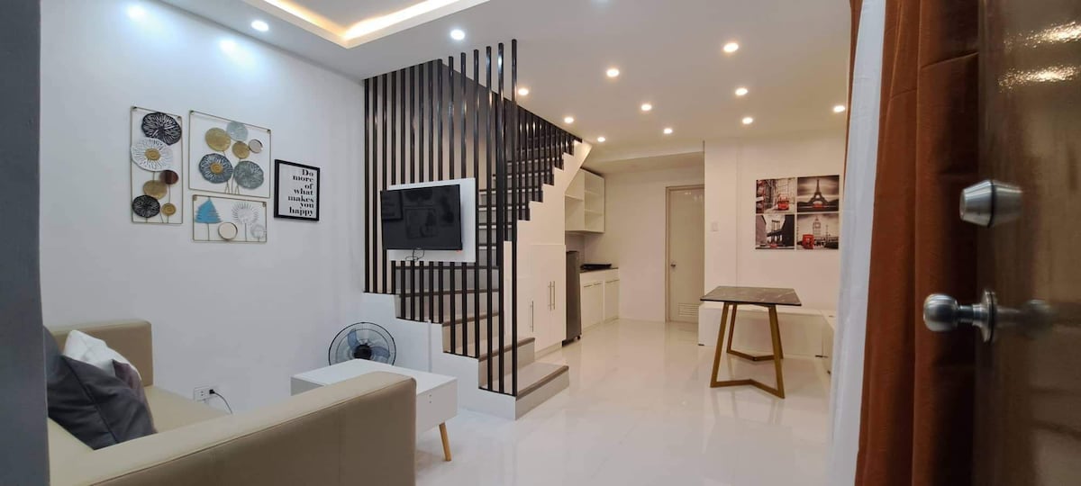 A haven for people who wants a staycation memorable with peaceful ambiance. It has a spacious and convertible bedroom with movable cabinet/division for a (two) 2 queen size bed. A Fully functional kitchen that is well lighted and ventilated where you can cook. With an 8cubic Fridge and a pantry cabinet for food: snacks, can goods, softdrinks available. • It's a fully airconditioned Haven with 2.5 HP Split type AC, plus 2 eletric fans for added air circulation • A clean bathroom with bidet etc